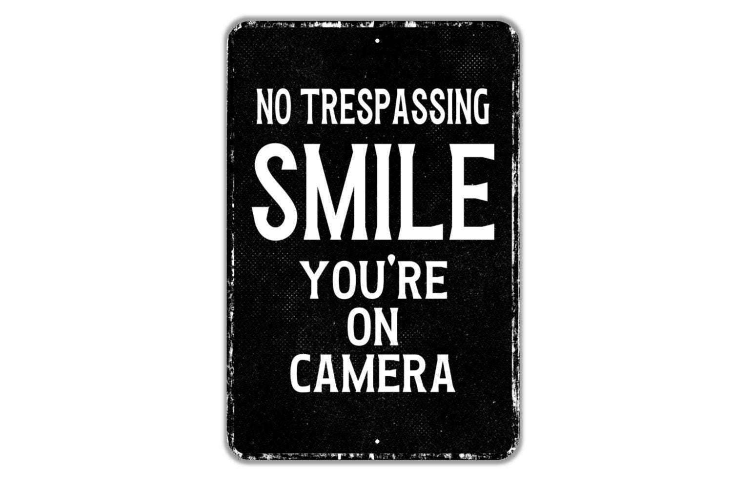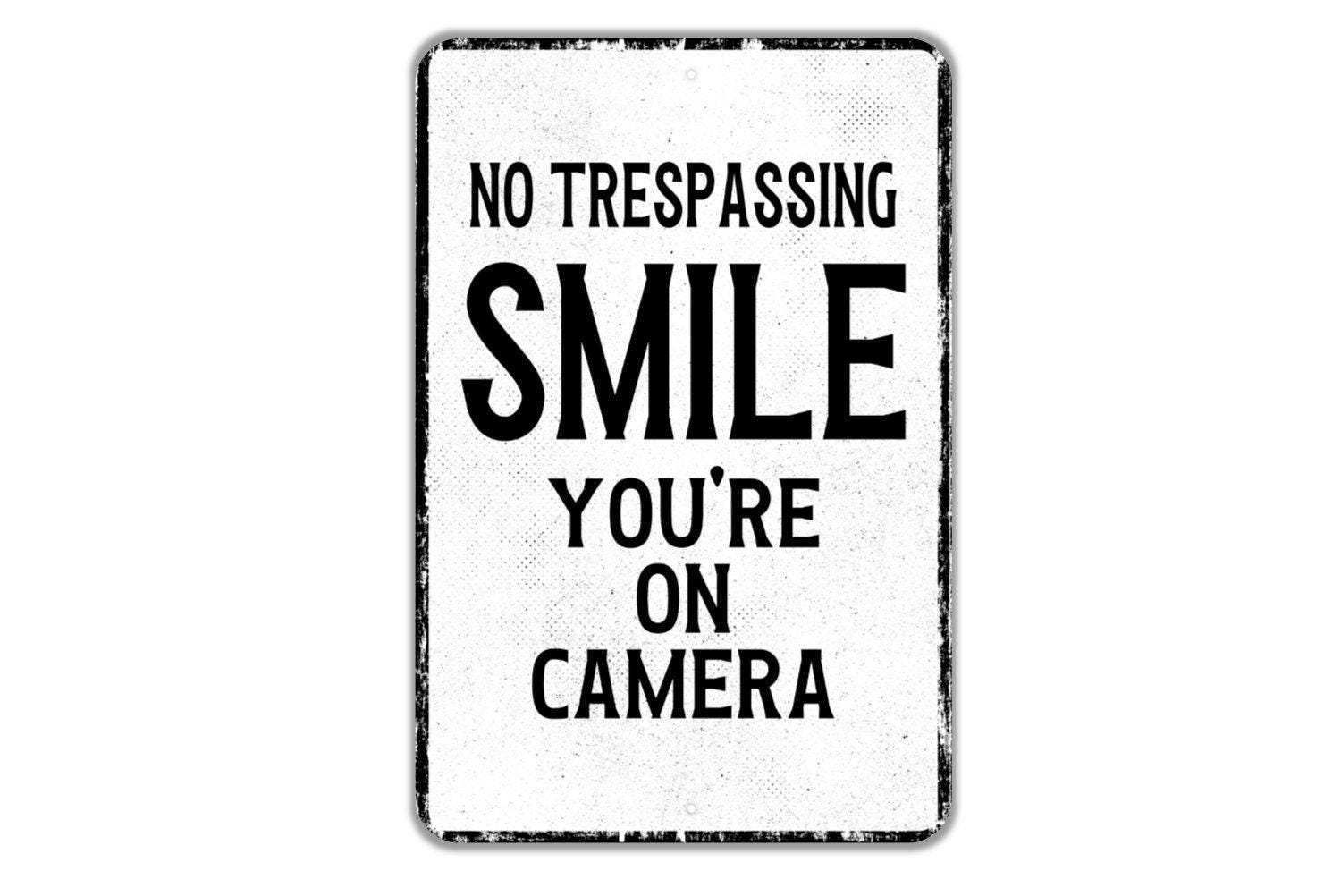 No Trespassing Smile You’re On Camera Sign | Security Warning Yard Sign | Funny Surveillance Wall Art | Vinyl Sticker or Metal Sign