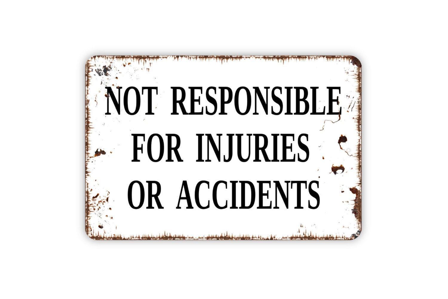 Not Responsible For Injuries Or Accidents Sign | Liability Disclaimer Warning Sign for Pool, Farm, Workplace | Metal Sign or Vinyl Sticker