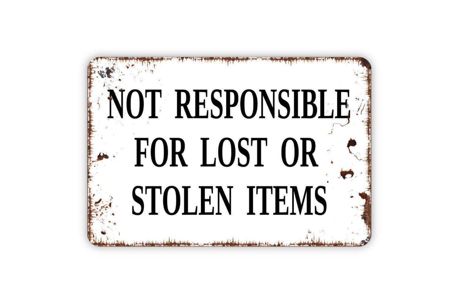 Not Responsible For Lost Or Stolen Items Sign - Metal Indoor or Outdoor Sign