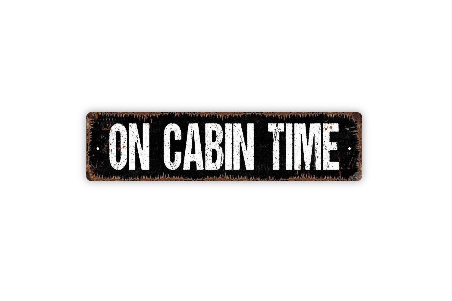On Cabin Time Sign | Rustic Lodge Metal Sign or Vinyl Sticker | Lake House, Mountain Retreat, or Camp Decor | Cabin Lover Gift