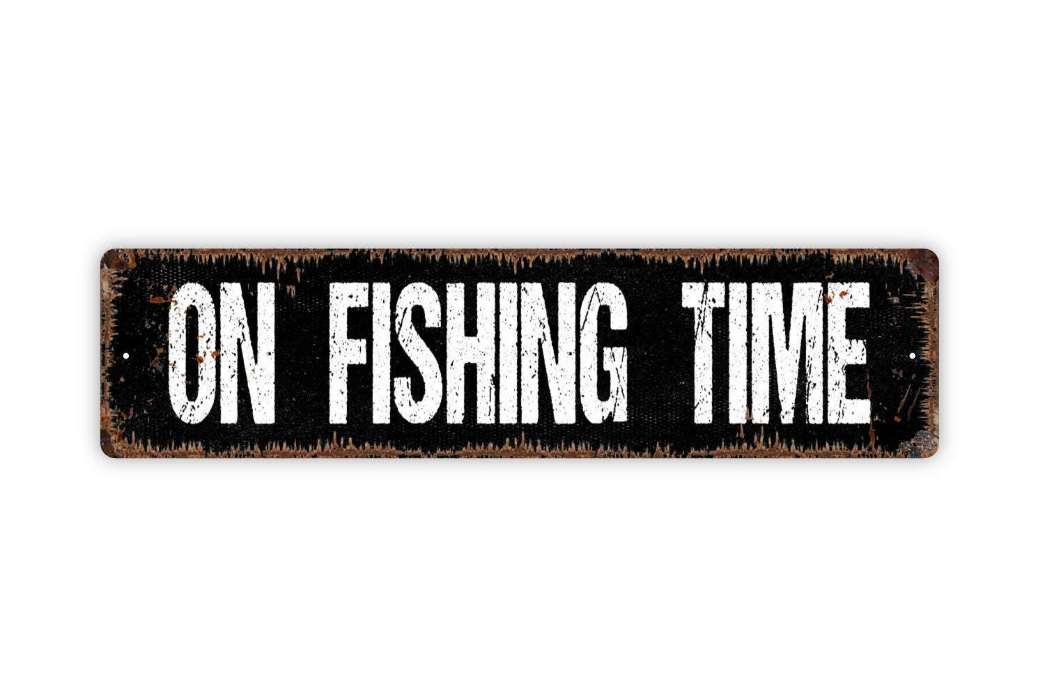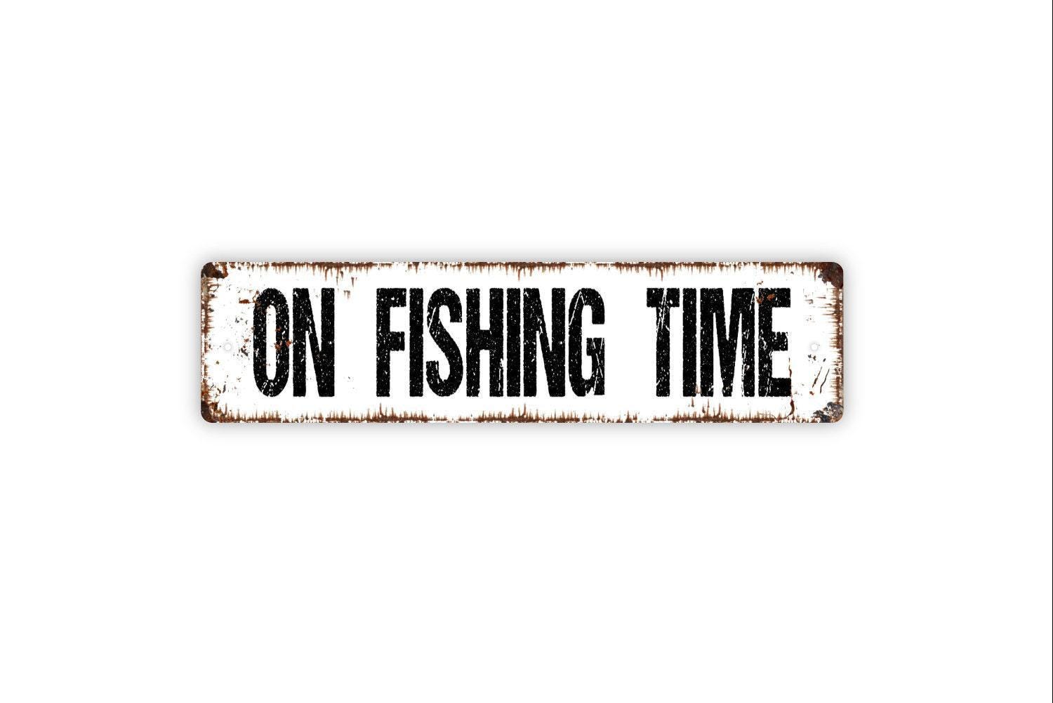 On Fishing Time Sign - Fisherman Lake River Bait And Tackle Vinyl Sticker Or Street Metal Sign or Door Name Plate Plaque