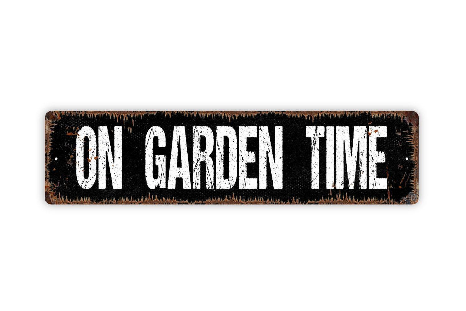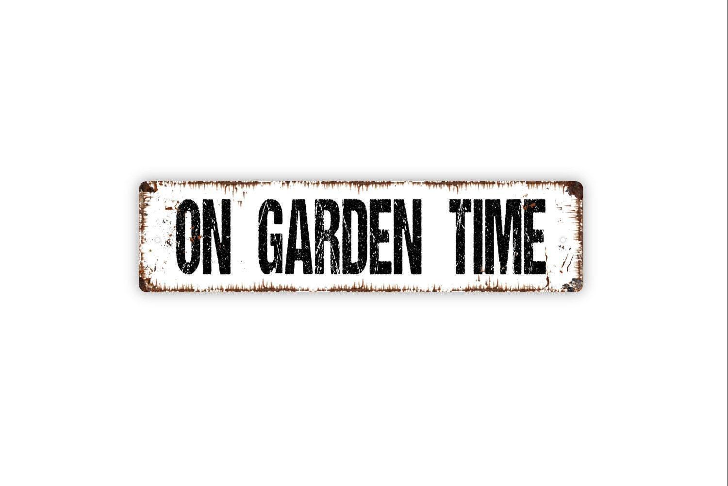 On Garden Time Sign - Gardener Fresh Flowers Farmers Market Produce Butterfly Vinyl Sticker Or Street Metal Sign or Door Name Plate Plaque