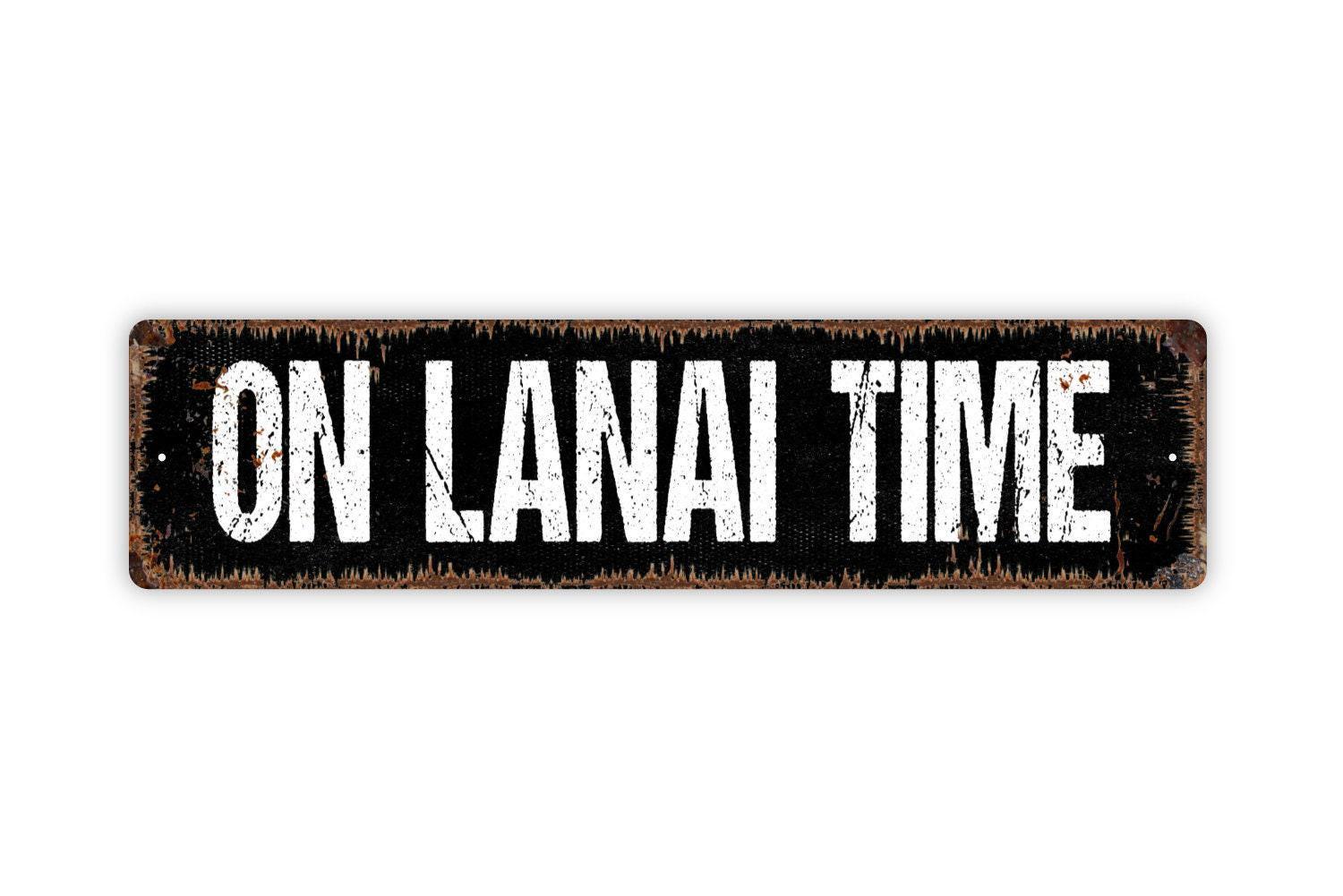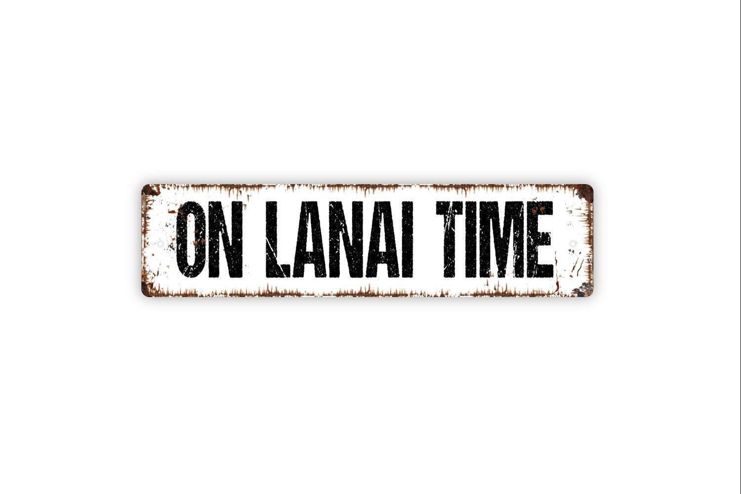 On Lanai Time Sign - Vinyl Sticker Or Metal Street Sign or Door Name Plate Plaque