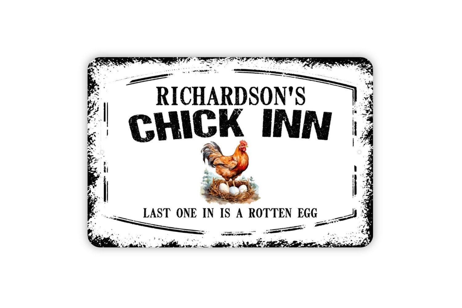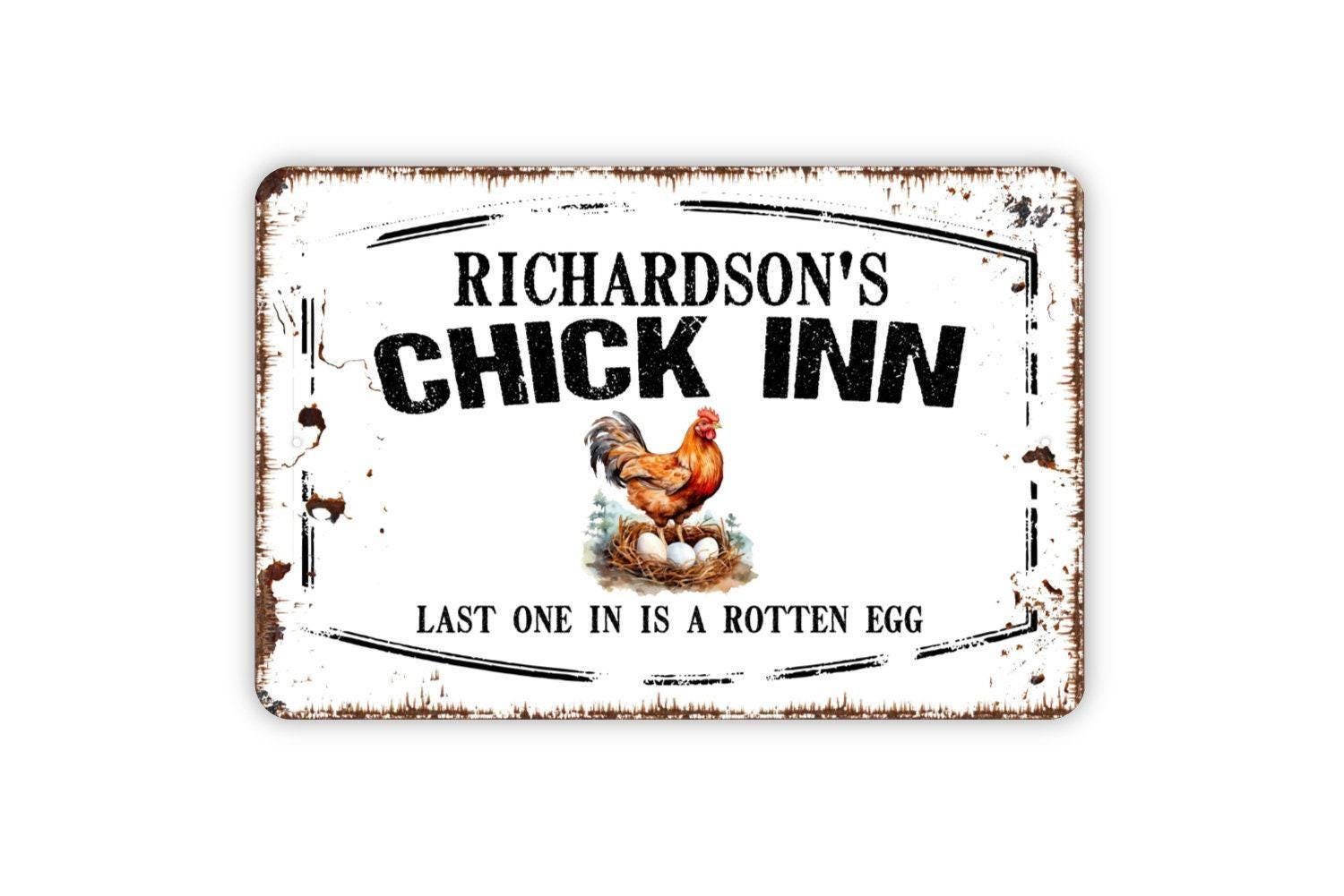 Personalized Chick Inn Sign - Custom Your Name Hen House Chicken Coop Last One In Is A Rotten Egg Metal Wall Art Indoor Or Outdoor