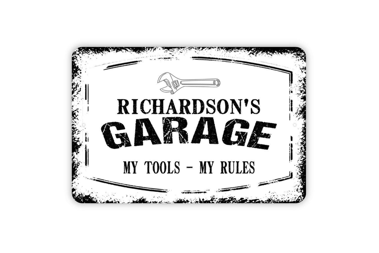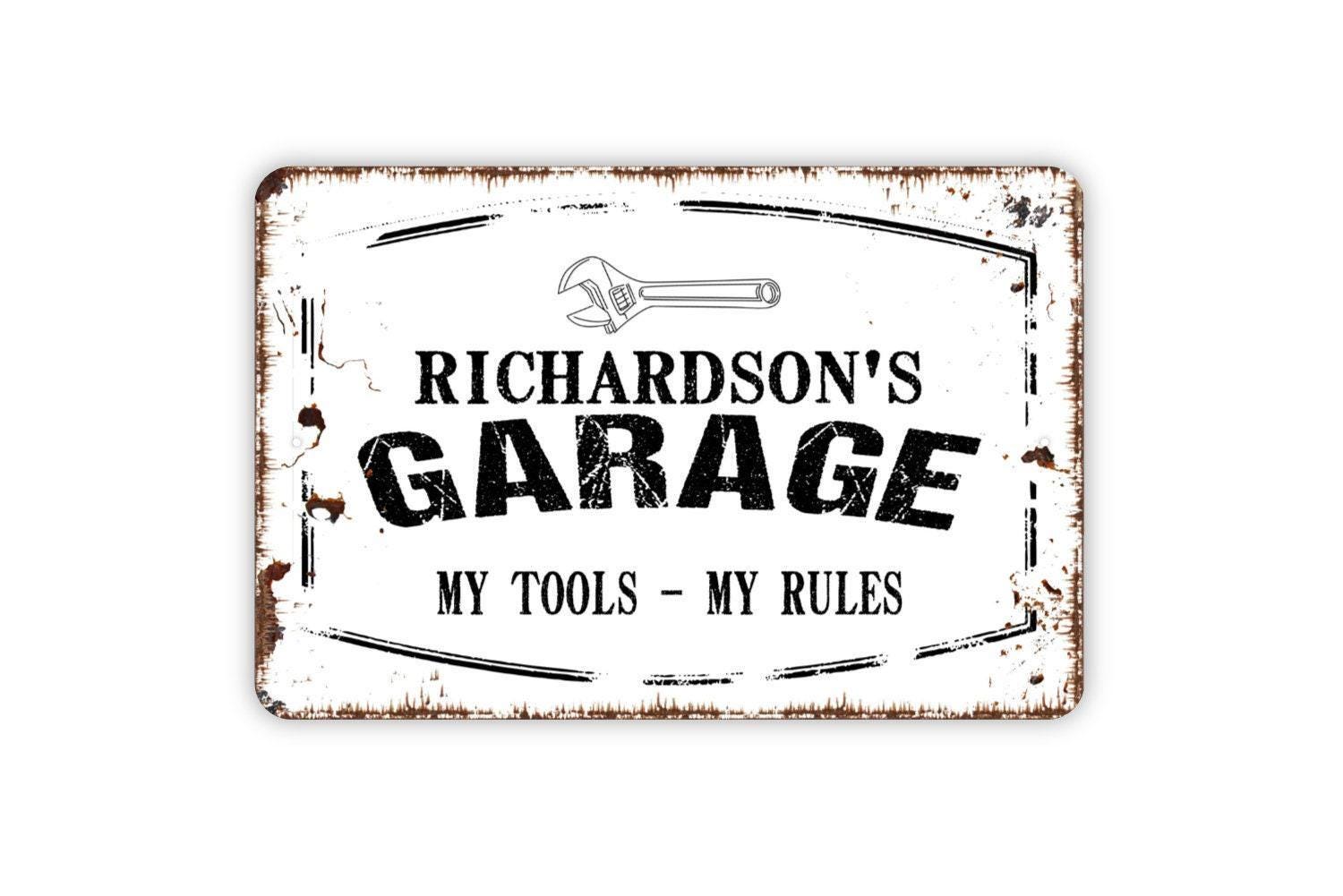 Personalized Garage Sign My Tools My Rules | Custom Rustic Workshop or Man Cave Wall Sign | Metal Sign or Vinyl Sticker Shop Décor Gift