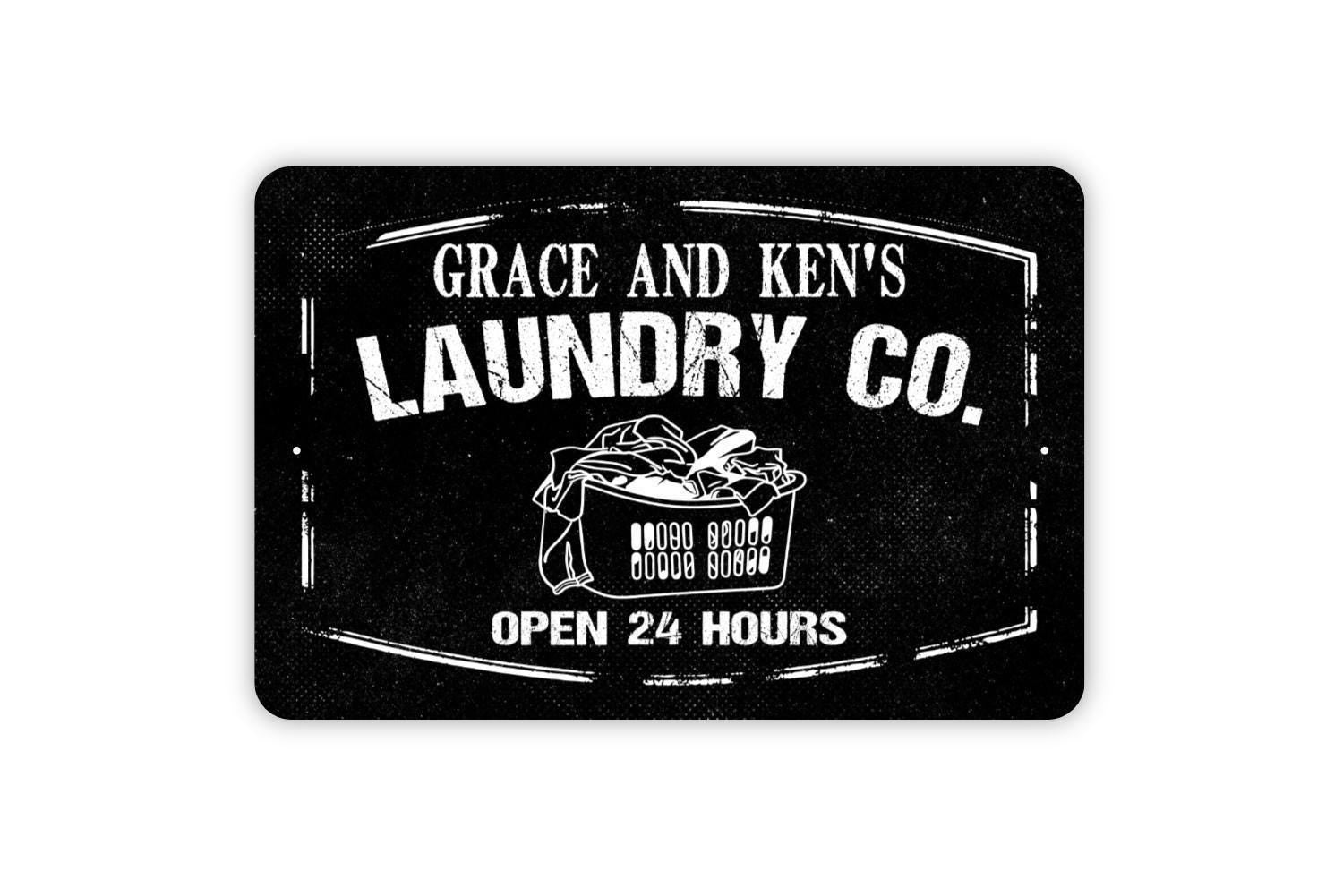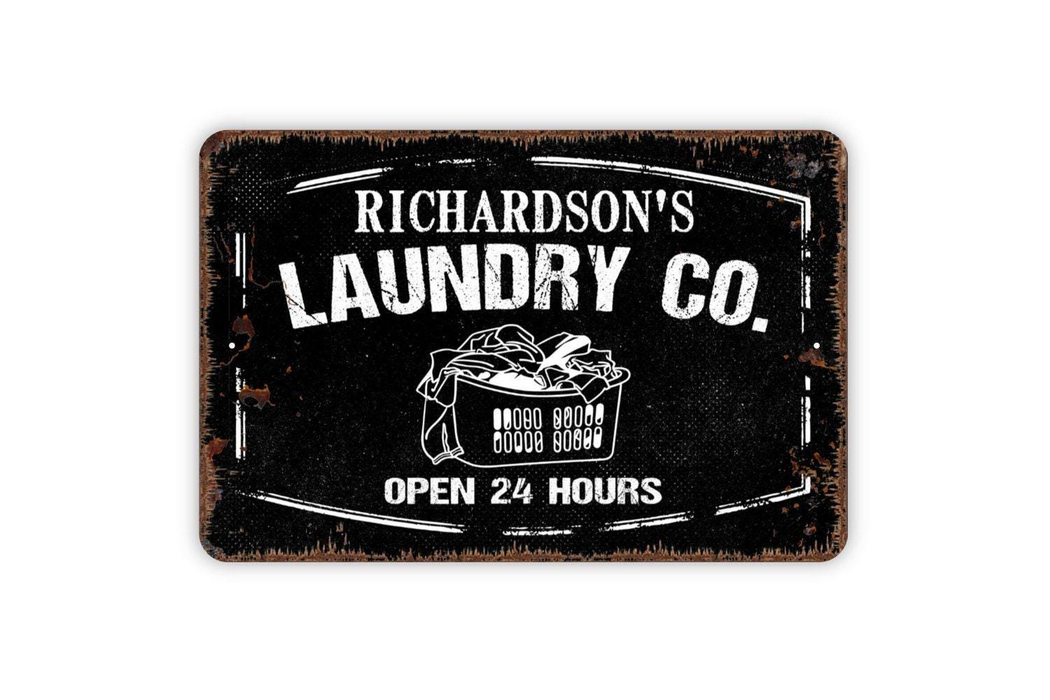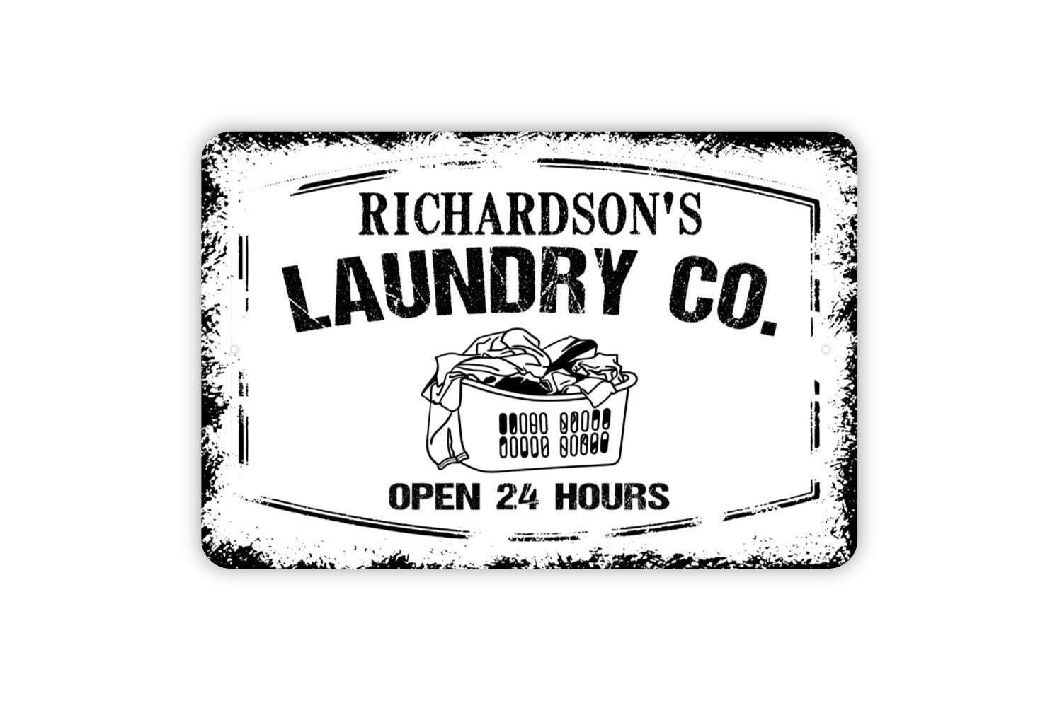 Personalized Laundry Company Sign Open 24 Hours | Custom Rustic Farmhouse Laundry Room Wall Sign | Metal Sign or Vinyl Sticker Home Décor
