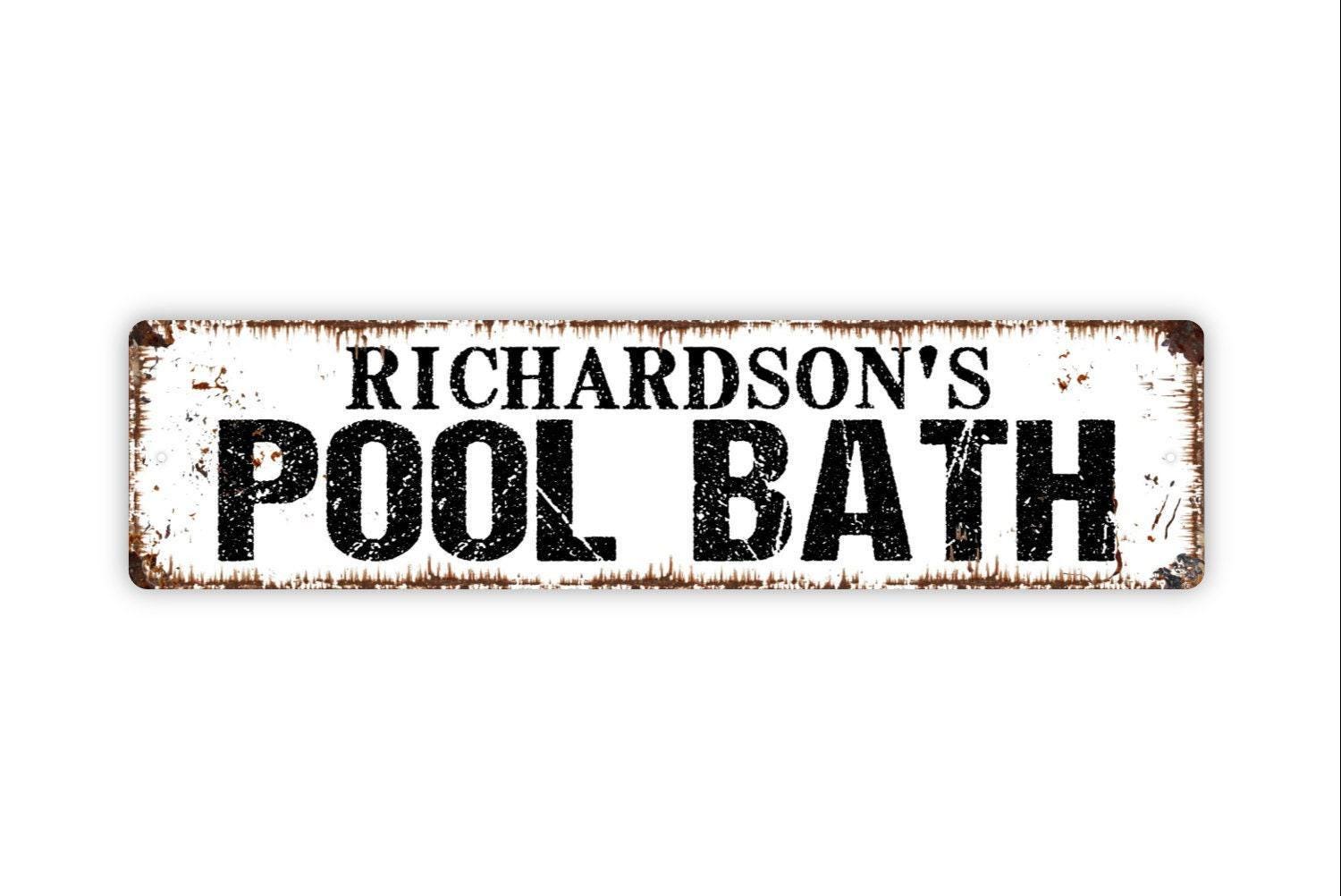 Personalized Pool Bath Sign | Custom Name Pool House Wall Decor | Metal Sign or Vinyl Sticker for Bathroom, Outdoor Pool, or Spa