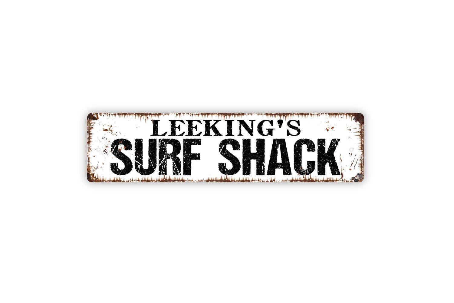 Personalized Surf Shack Sign – Custom Name Rustic Beach House Wall Decor – Coastal Ocean Surfboard Themed Home Sign – Metal Sign or Sticker