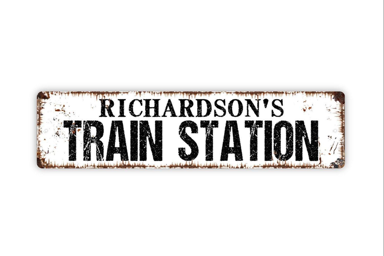 Personalized Train Station Sign, Custom Metal Sign, Vinyl Sticker Or Street Sign or Door Name Plate Plaque