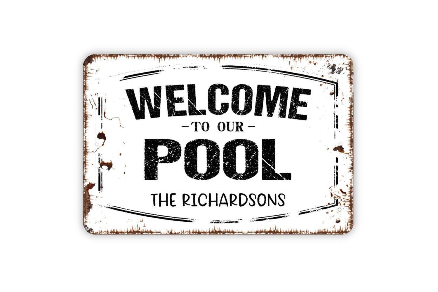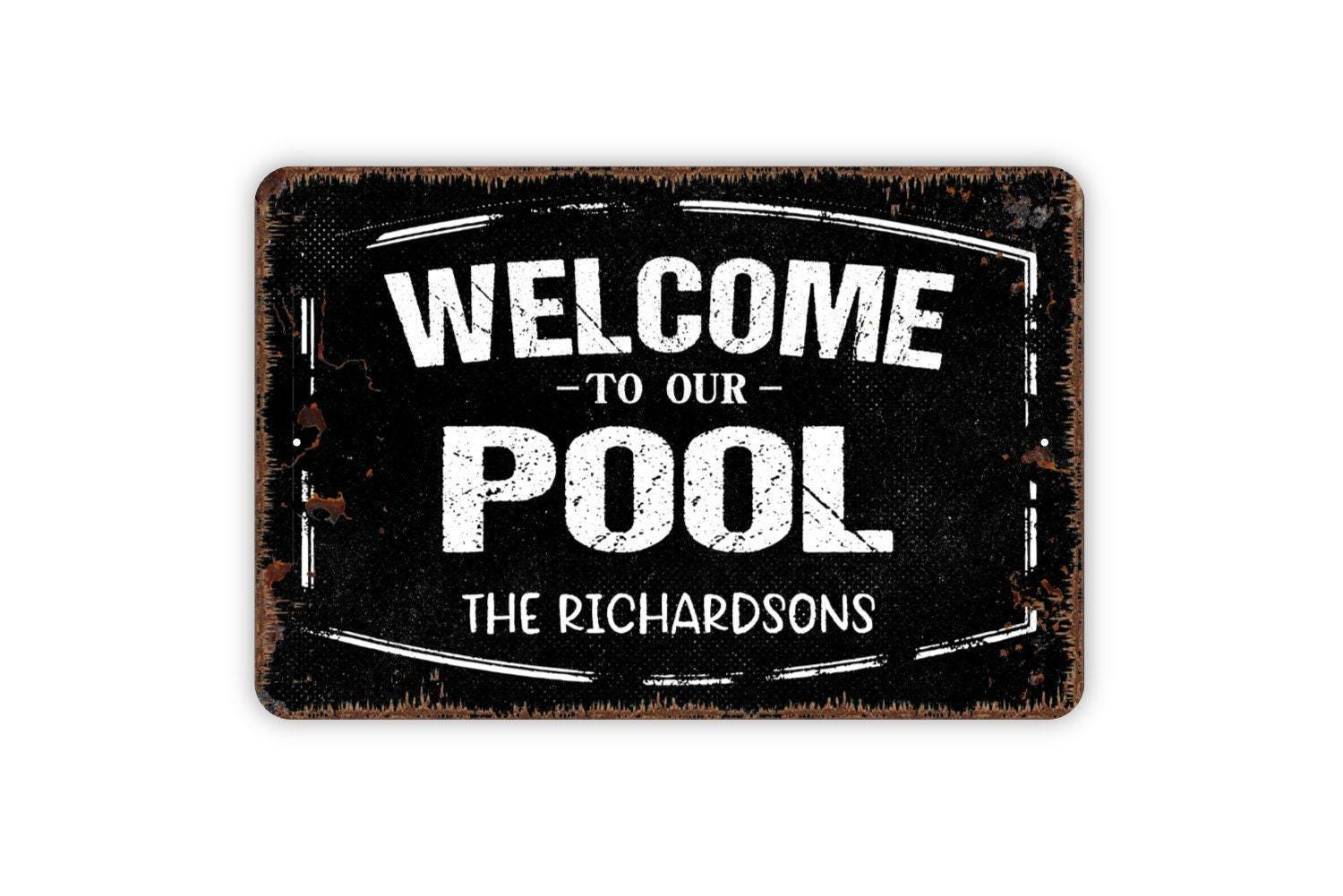 Personalized Welcome To Our Pool Sign – Custom Family Name Plaque – Backyard Patio Deck Poolside Wall Decor – Metal Sign or Sticker