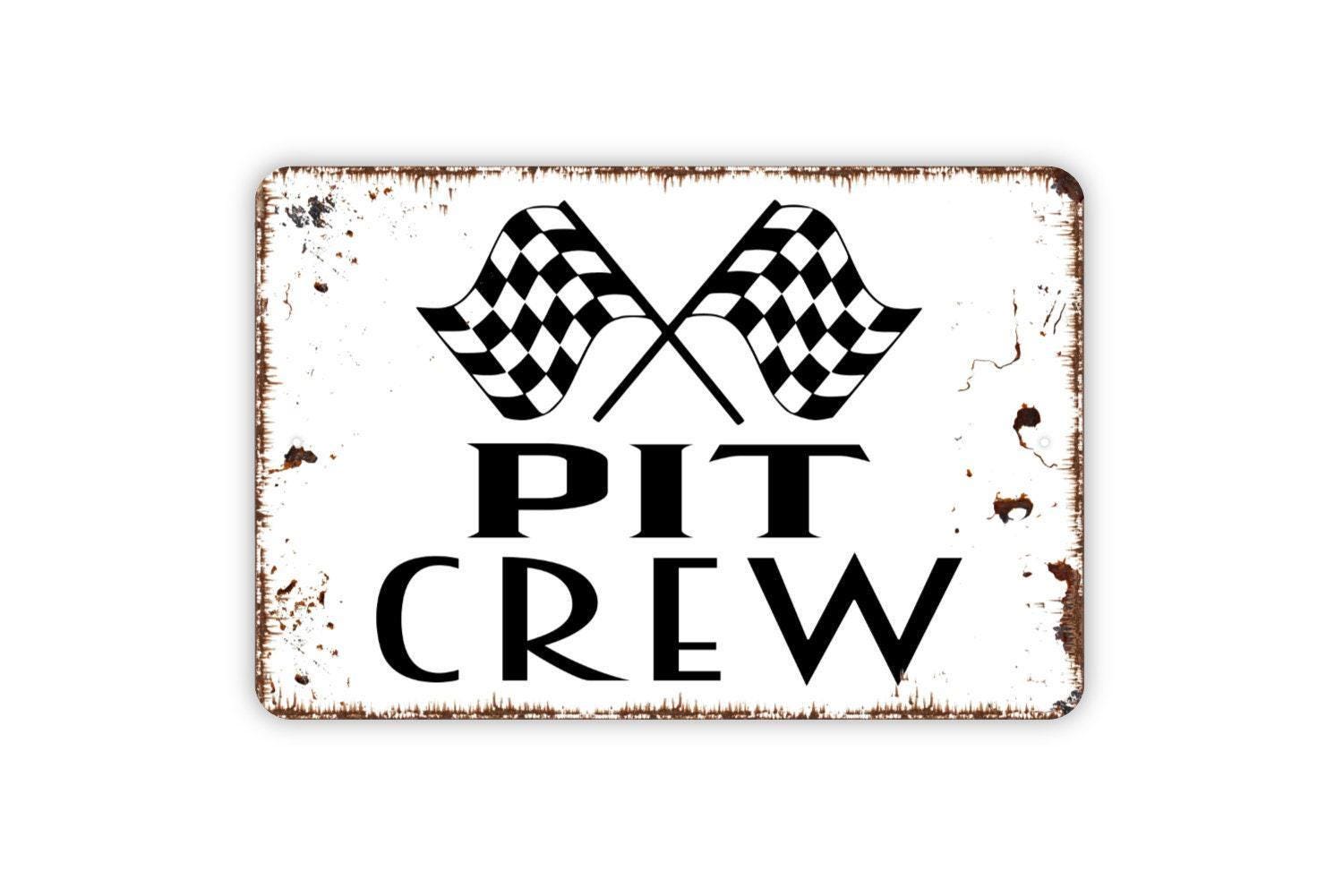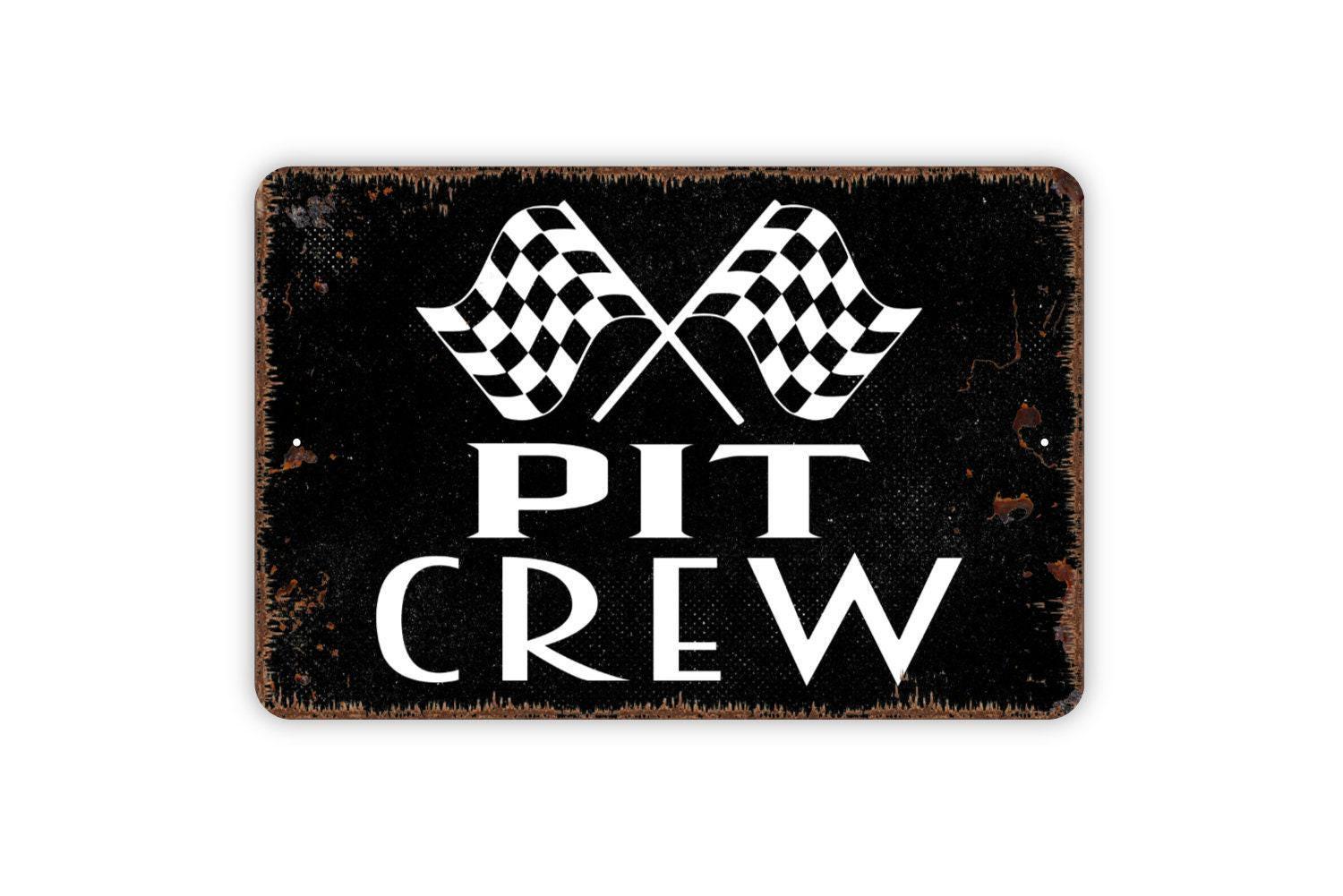 Pit Crew With Checkered Flags Sign - Racing Metal Indoor or Outdoor Wall Art