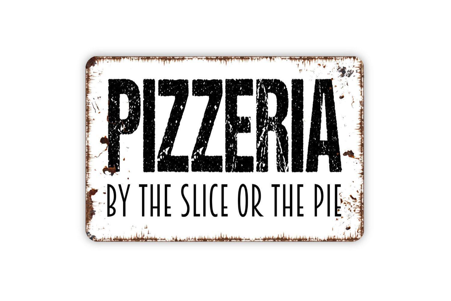 Pizzeria By The Slice Or The Pie Sign | Rustic Kitchen, Dining, or Restaurant Wall Décor | Pizza Metal Sign or Vinyl Sticker Gift
