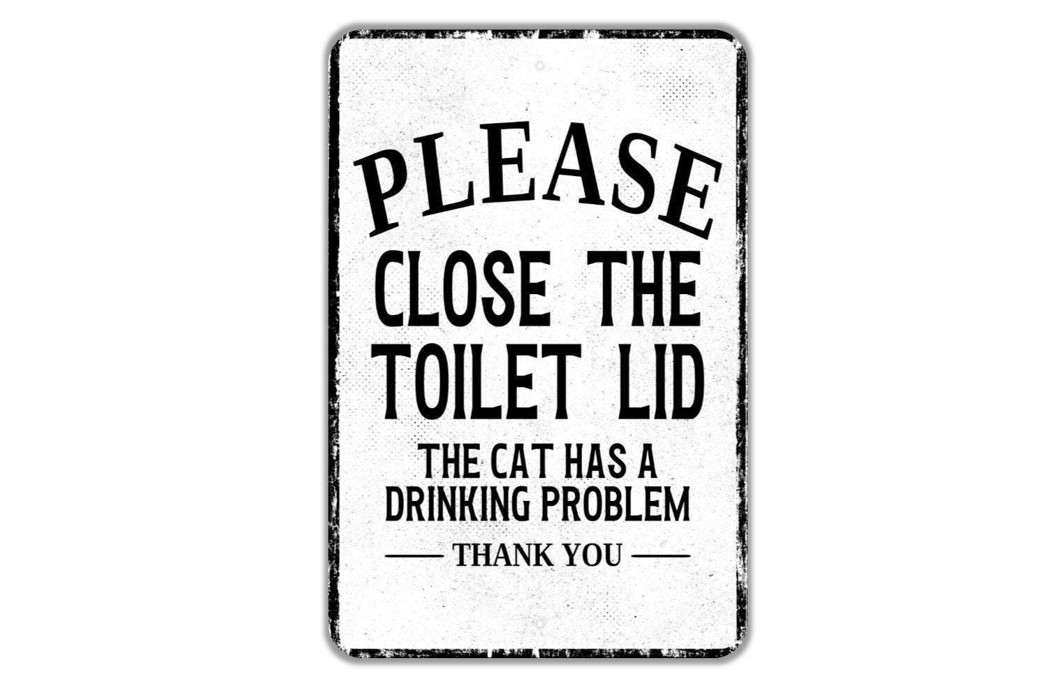 Please Close The Lid The Cat Has A Drinking Problem Thank You Sign Metal Wall Art or Vinyl Sticker for Bathroom, Toilet Humor, Funny Cat