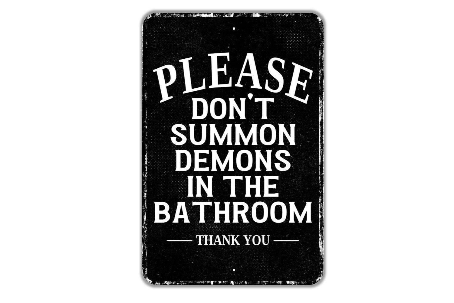 Please Don’t Summon Demons In The Bathroom Thank You Sign | Funny Gothic Metal Sign or Vinyl Sticker | Bathroom Humor, Spooky Wall Decal