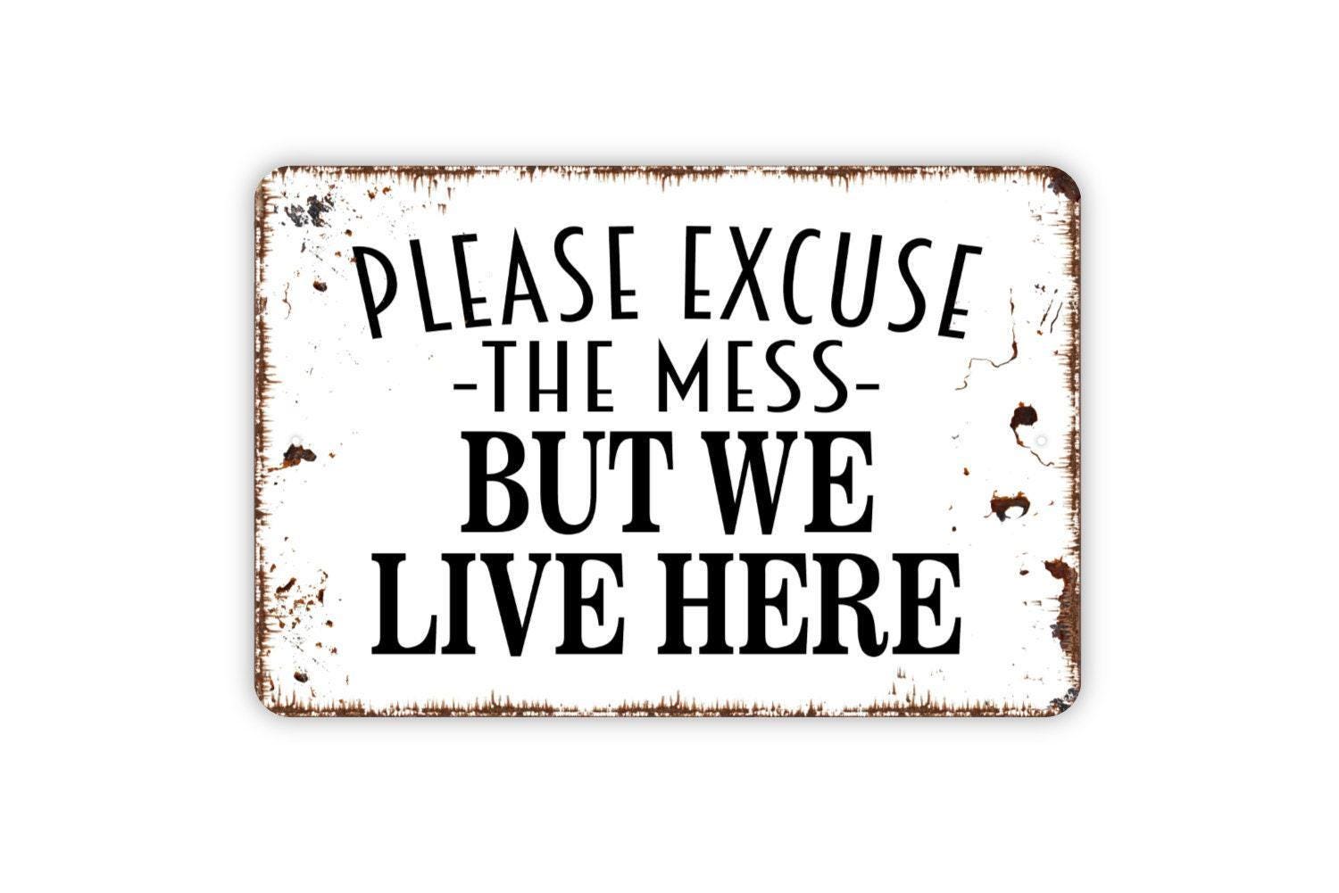Please Excuse The Mess But We Live Here Sign - Funny Welcome Metal Wall Art - Indoor or Outdoor