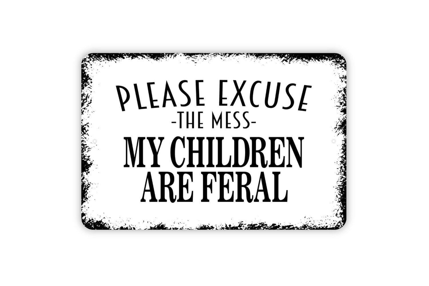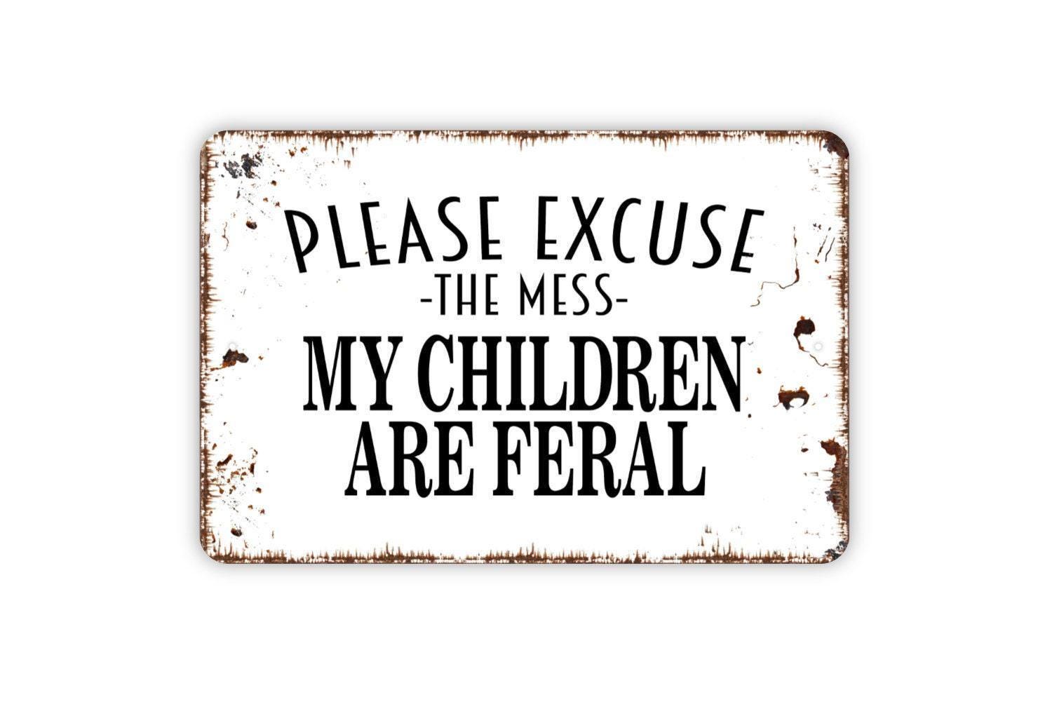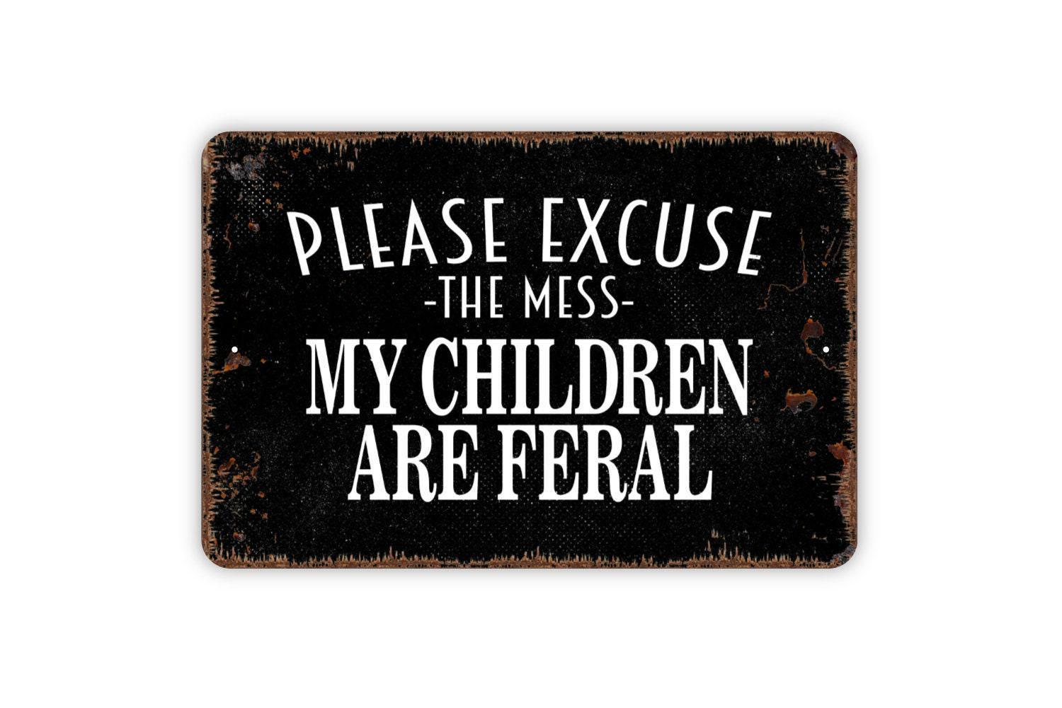 Please Excuse The Mess My Children Are Feral Sign - Funny Welcome Metal Indoor or Outdoor Wall Art