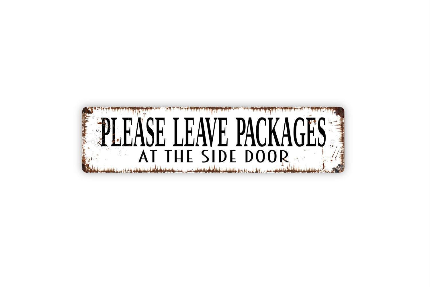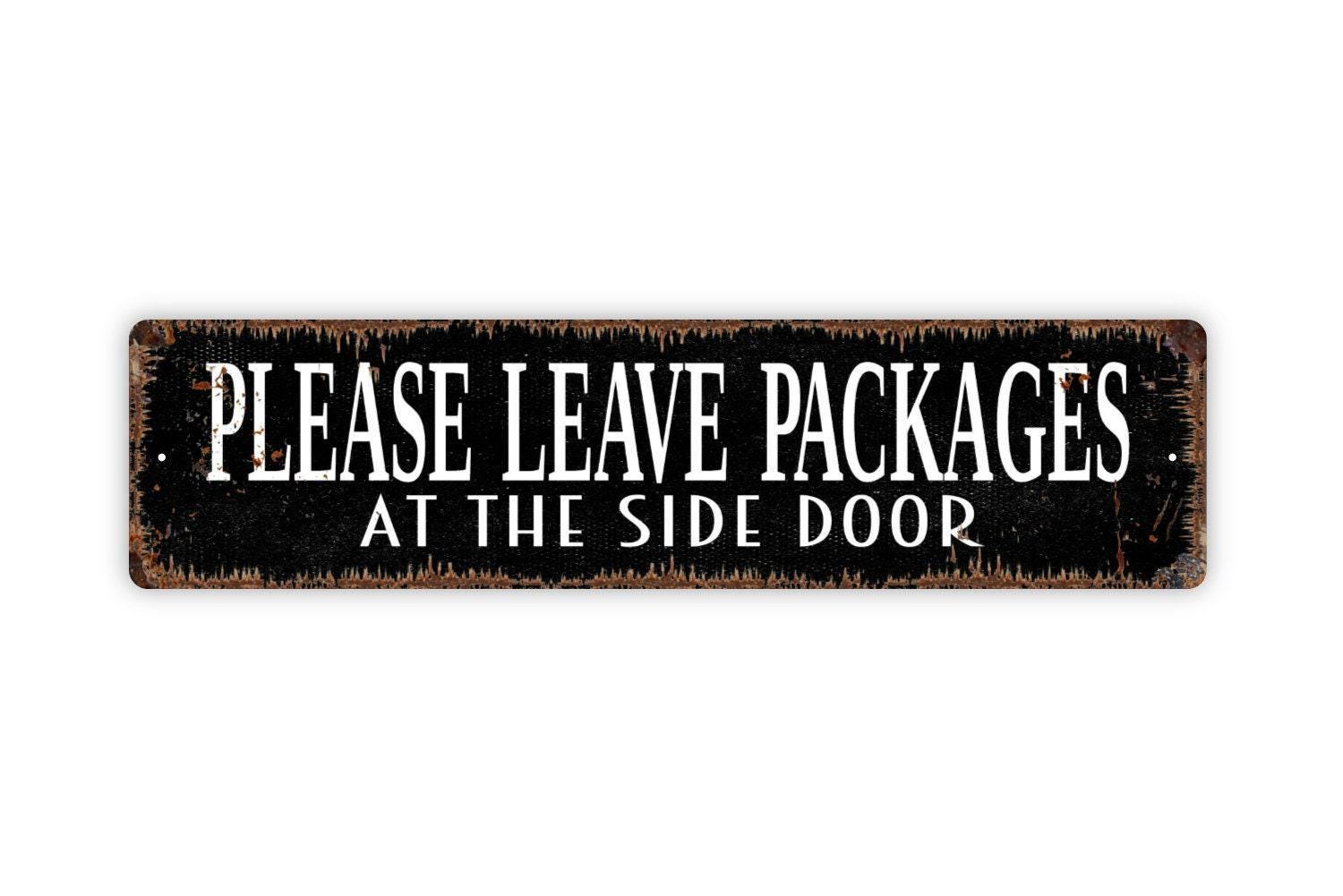 Please Leave Packages At The Side Door Sign - Metal Vinyl Sticker Or Street Sign or Door Name Plate Plaque