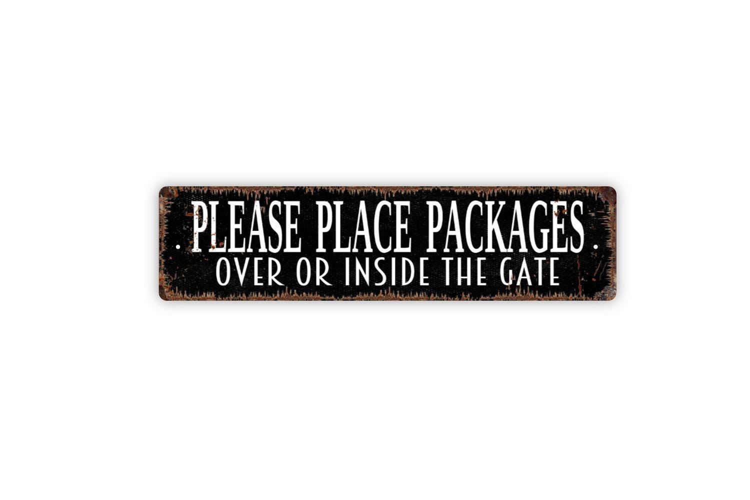 Please Place Packages Over Or Inside The Gate Sign - Deliveries Delivery Driver Instructions Metal Street Sign or Door Name Plate Plaque