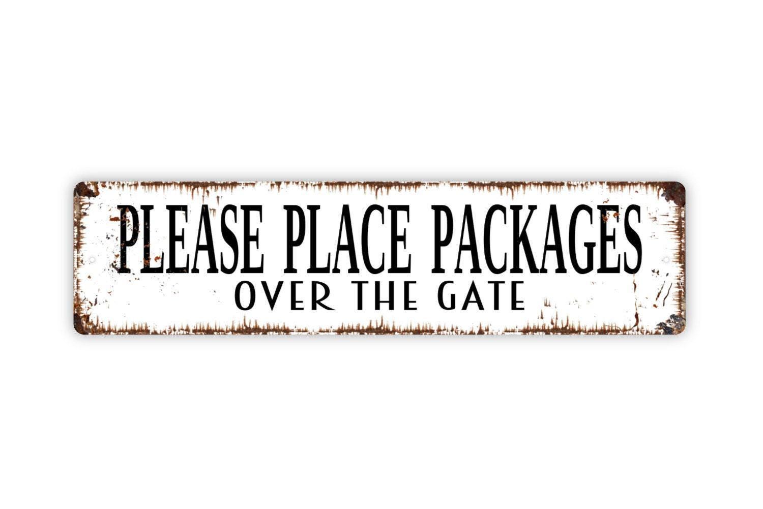 Please Place Packages Over The Gate Sign for Home or Business | Delivery Drop Off Parcel Sign | Metal Wall Sign or Vinyl Sticker