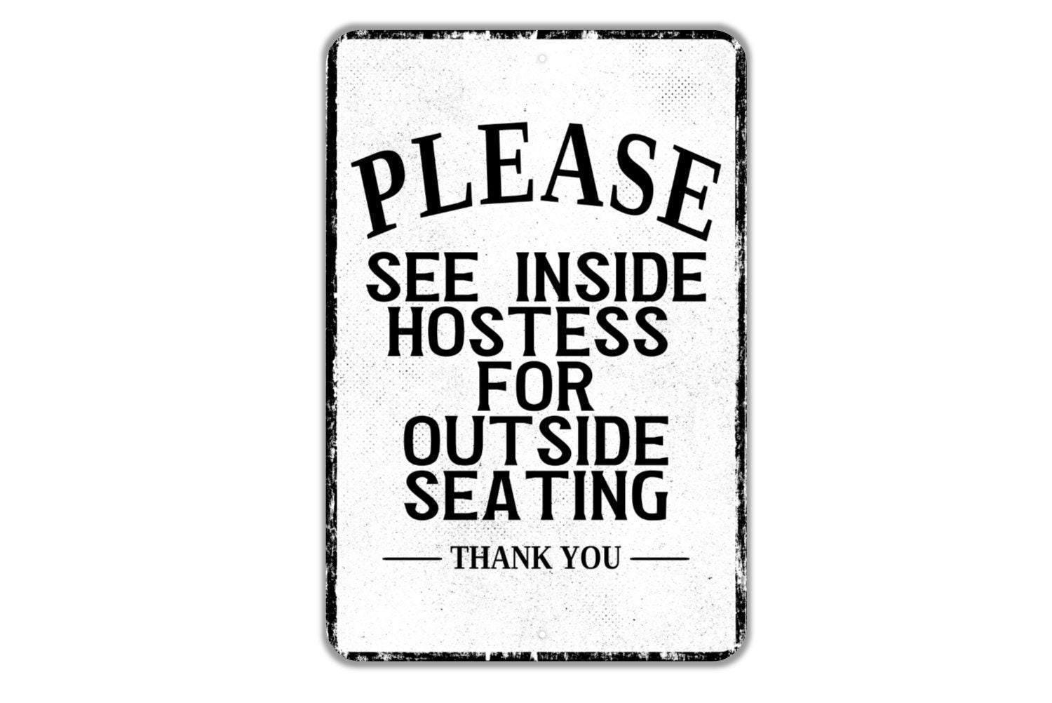 Please See Inside Hostess For Outside Seating Thank You Sign | Restaurant Patio Dining Direction Sign | Vinyl Sticker or Metal Wall Sign