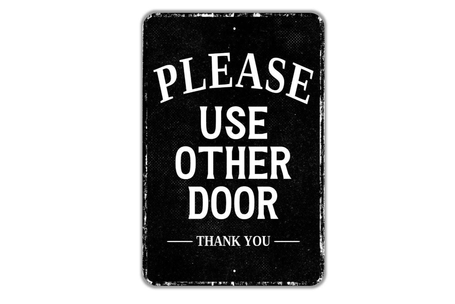 Direct guests with this Please Use Other Door Thank You Sign, available in multiple sizes as metal wall art or vinyl stickers. Perfect for offices, restaurants, storefronts, or homes, this sign provides a clear and polite message for visitors. A practical and stylish addition to any entryway or business entrance.