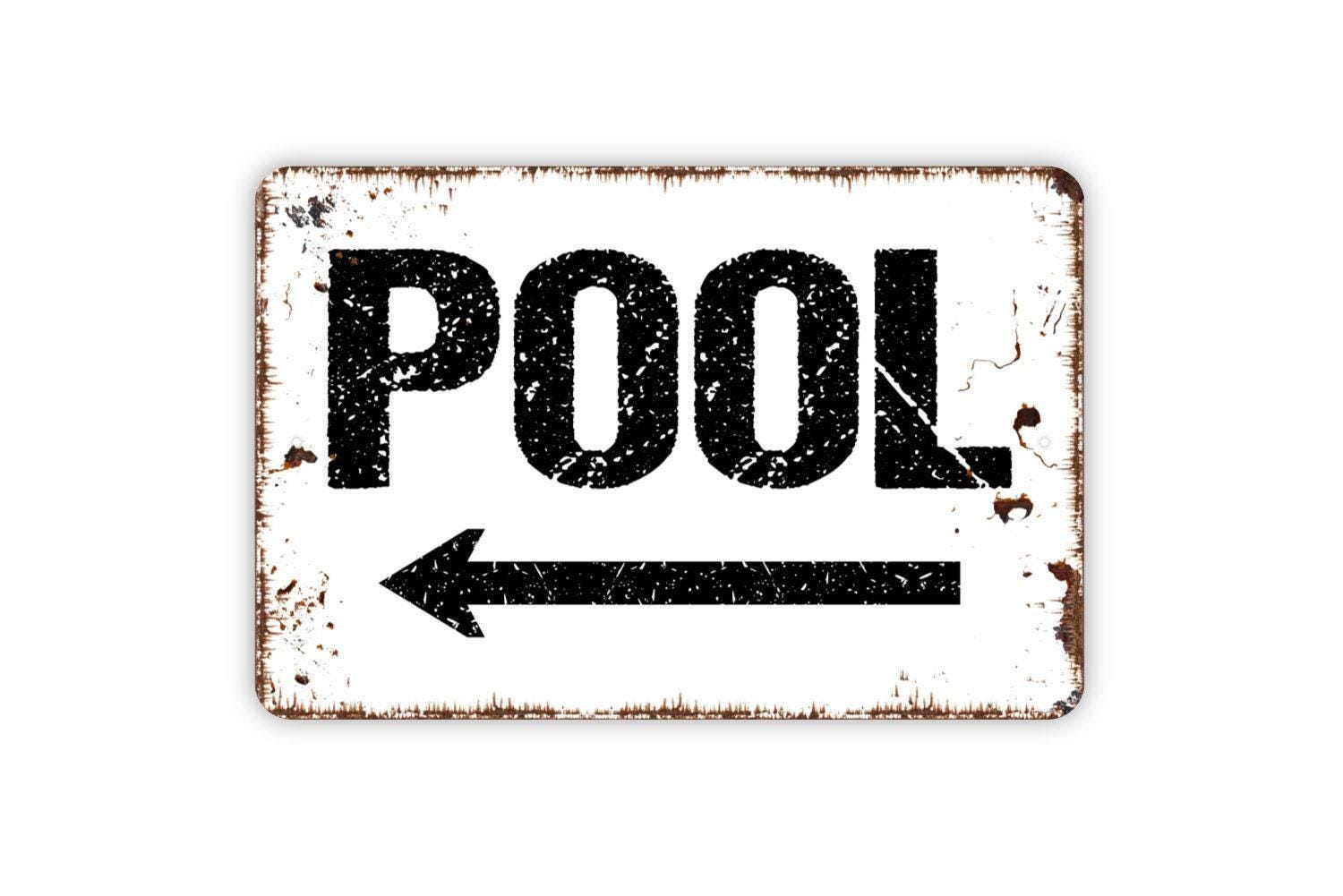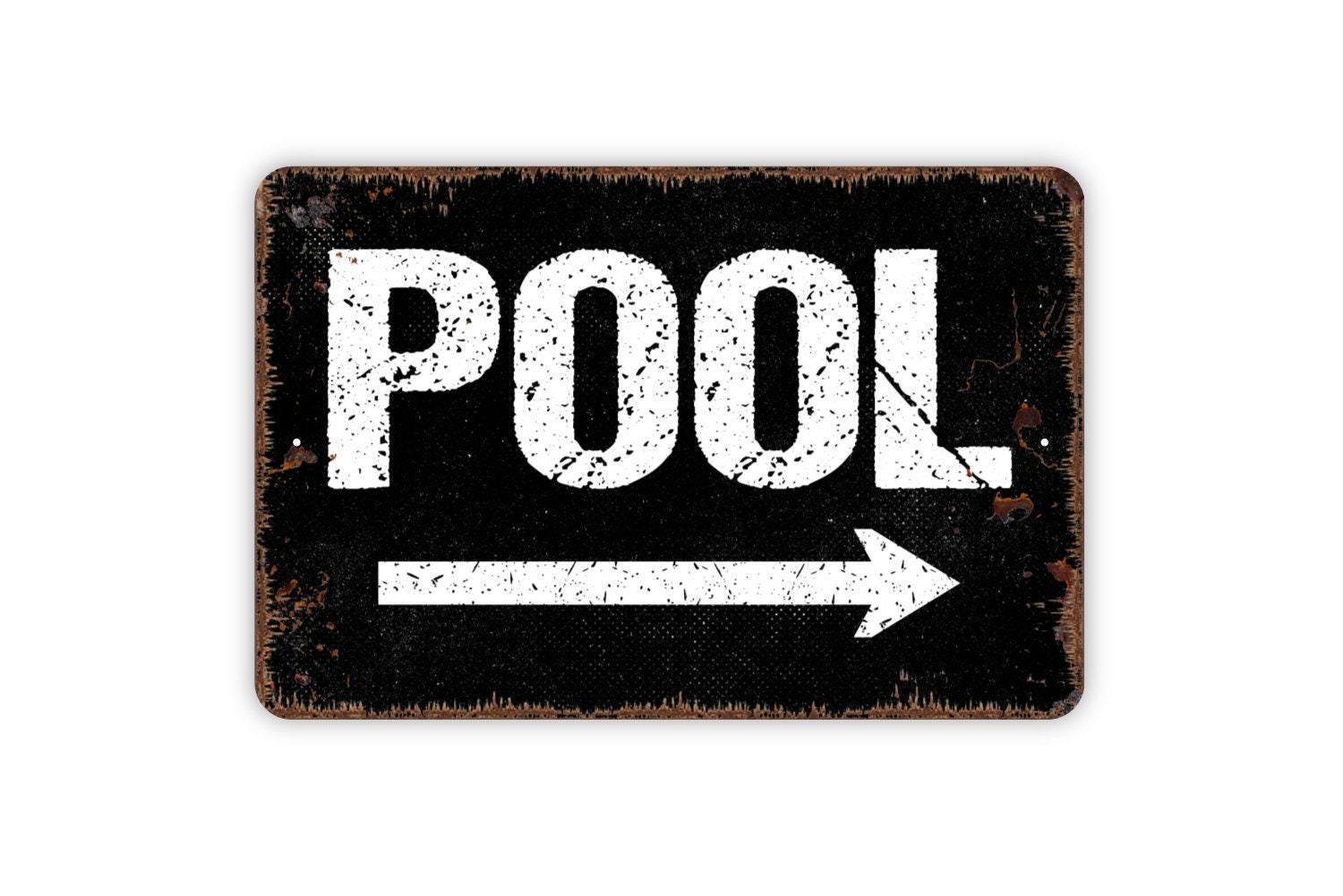 Guide guests with this “Pool” arrow sign, available pointing right or left, as a metal sign or vinyl sticker. Perfect for backyards, patios, resorts, or pool houses, it provides a clear and stylish directional marker. A practical and decorative addition to outdoor spaces, vacation homes, or summer retreats.