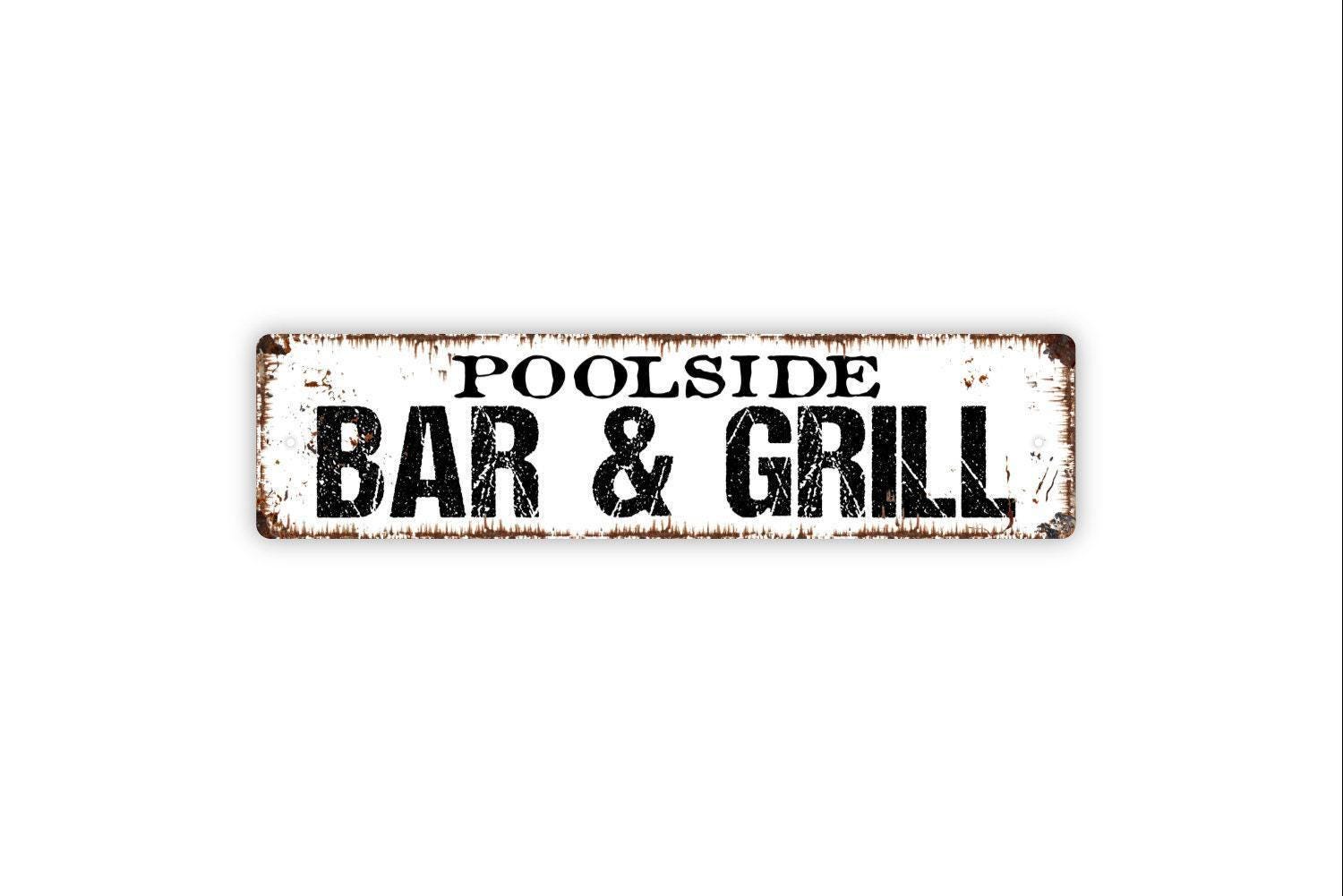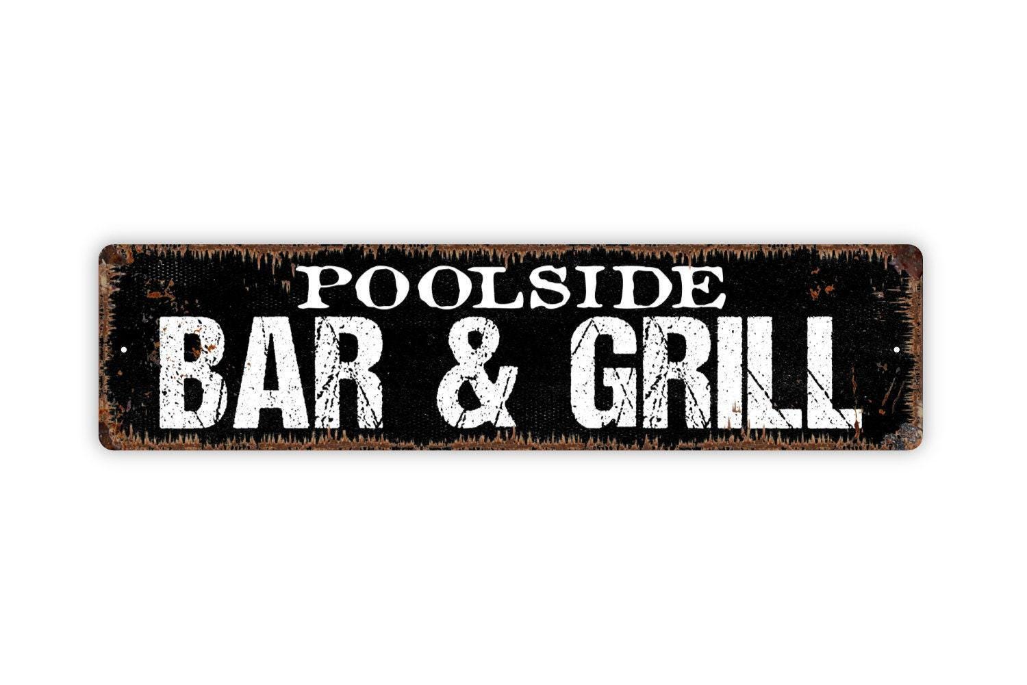 Poolside Bar and Grill Sign - Swimming Pool Backyard BBQ Smoker Fire Pit Bar Pub Rustic Street Metal Sign or Door Name Plate Plaque