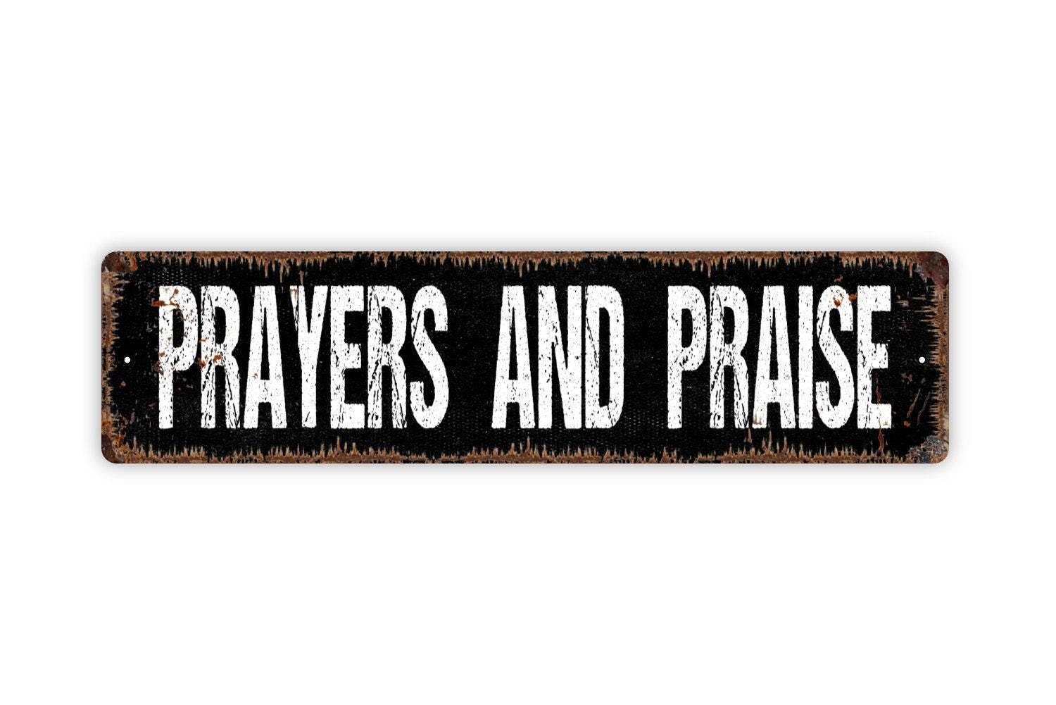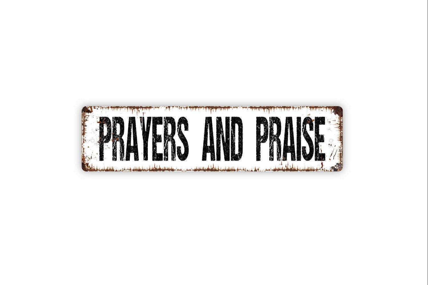 Prayers and Praise Metal Sign - Christian Affirmation Pray Worship Vinyl Sticker Or Street Metal Sign or Door Name Plate Plaque