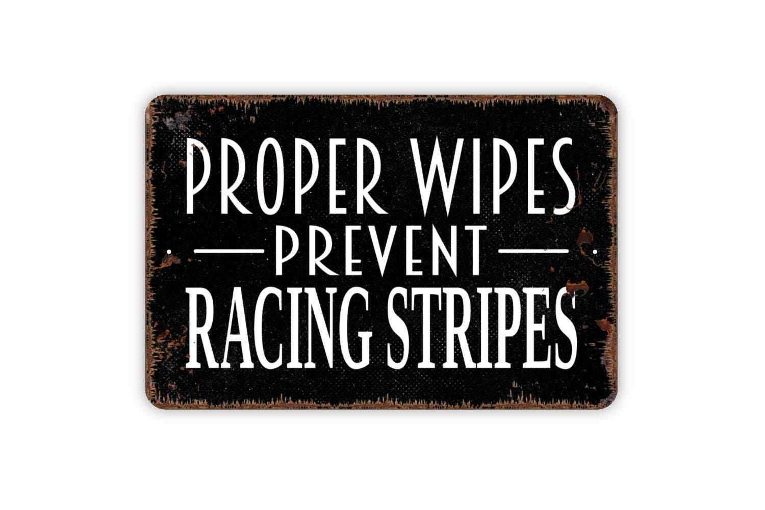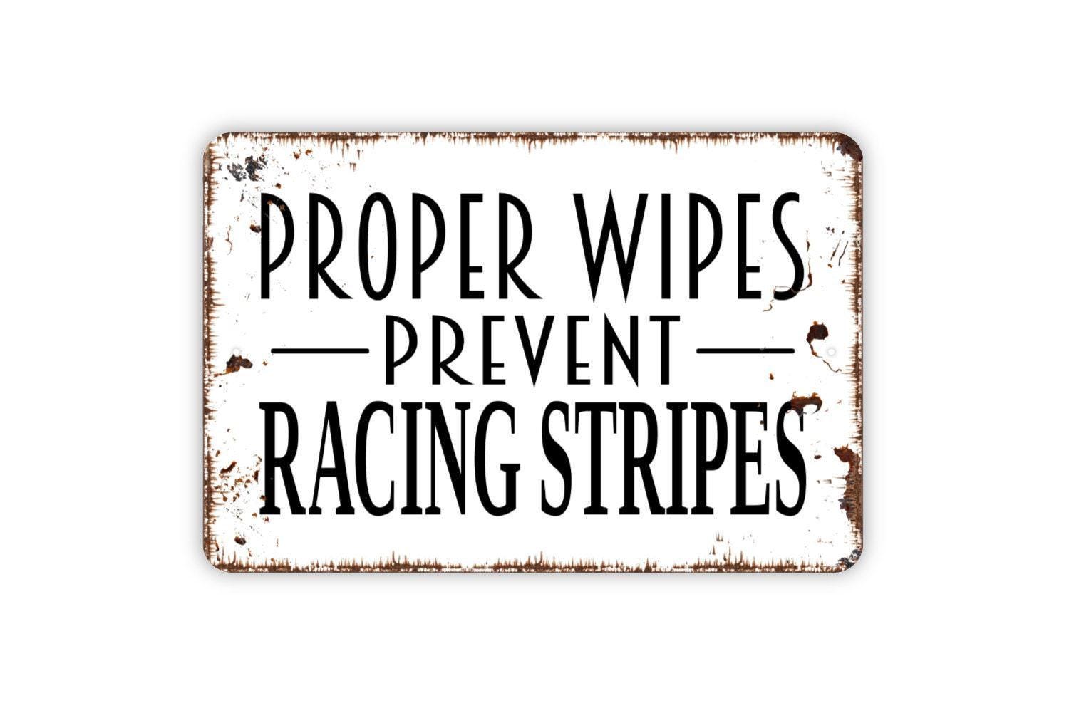 Proper Wipes Prevent Racing Stripes Sign - Funny Bathroom Farmhouse Sign, Contemporary Modern Wall Metal Sign