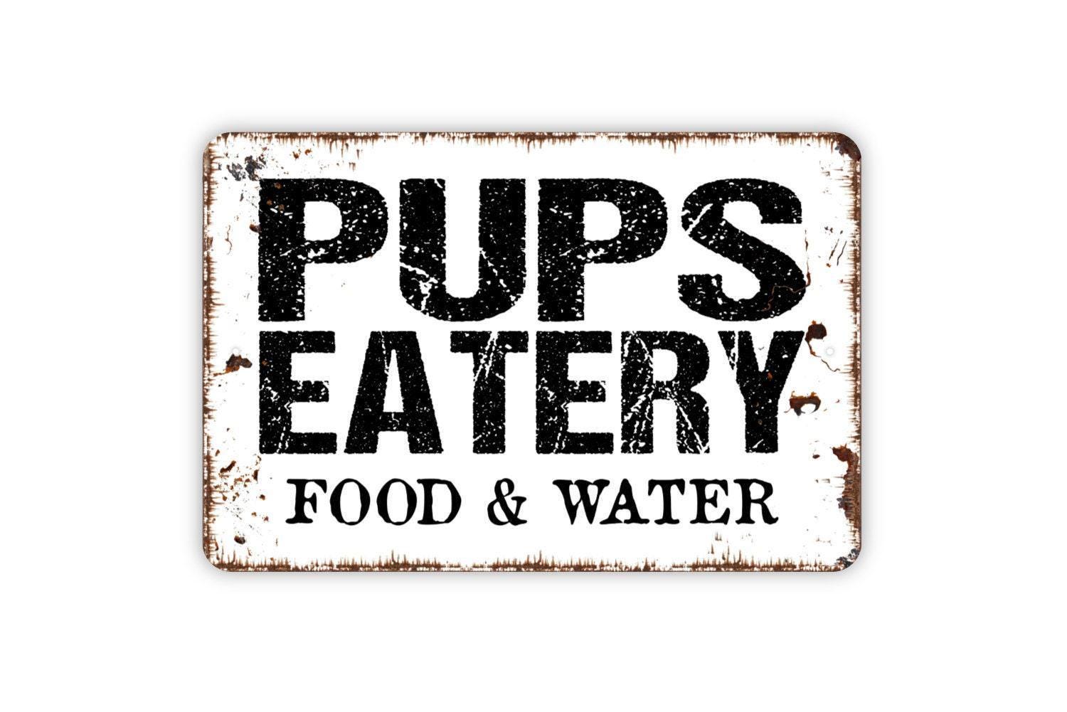 Pups Eatery Food and Water Sign | Cute Dog Feeding Station Wall Sign | Pet Kitchen or Mudroom Décor | Metal Pet Sign or Vinyl Sticker Gift