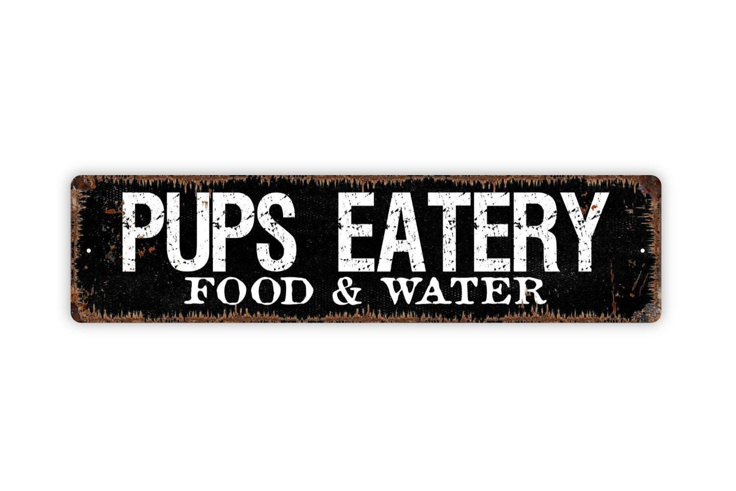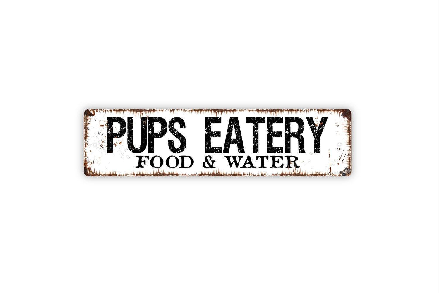 Pups Eatery Food and Water Sign - Funny Dog Vinyl Sticker Or Metal Street Sign or Door Name Plate Plaque