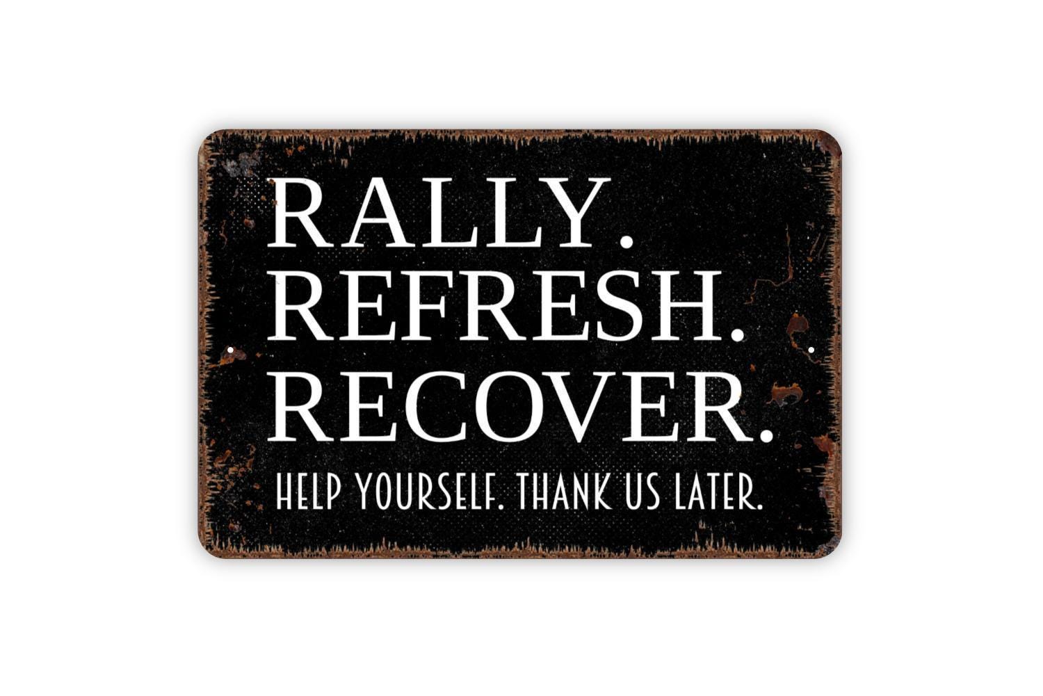 Rally Refresh Recover Help Yourself Thank Us Later Sign - Refreshment Hydration Station Sports Race Team Metal Indoor or Outdoor Wall Art