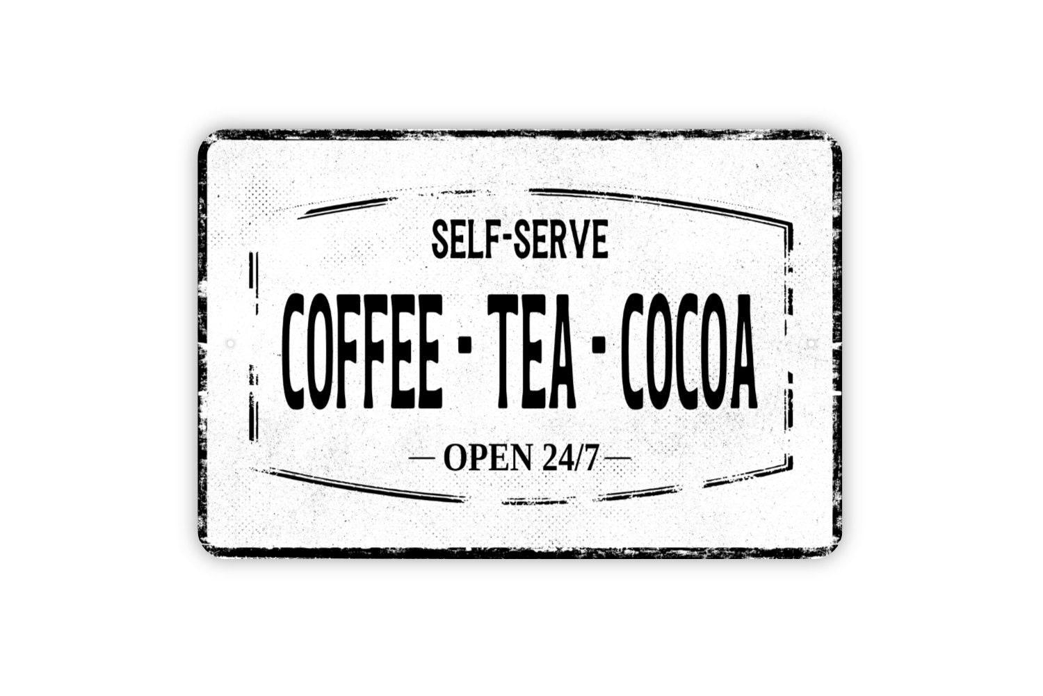 Self-Serve Coffee Tea Cocoa Sign | Hot Drink Station Wall Decor | Kitchen Cafe Bar Wall Art | Vinyl Sticker or Metal Sign