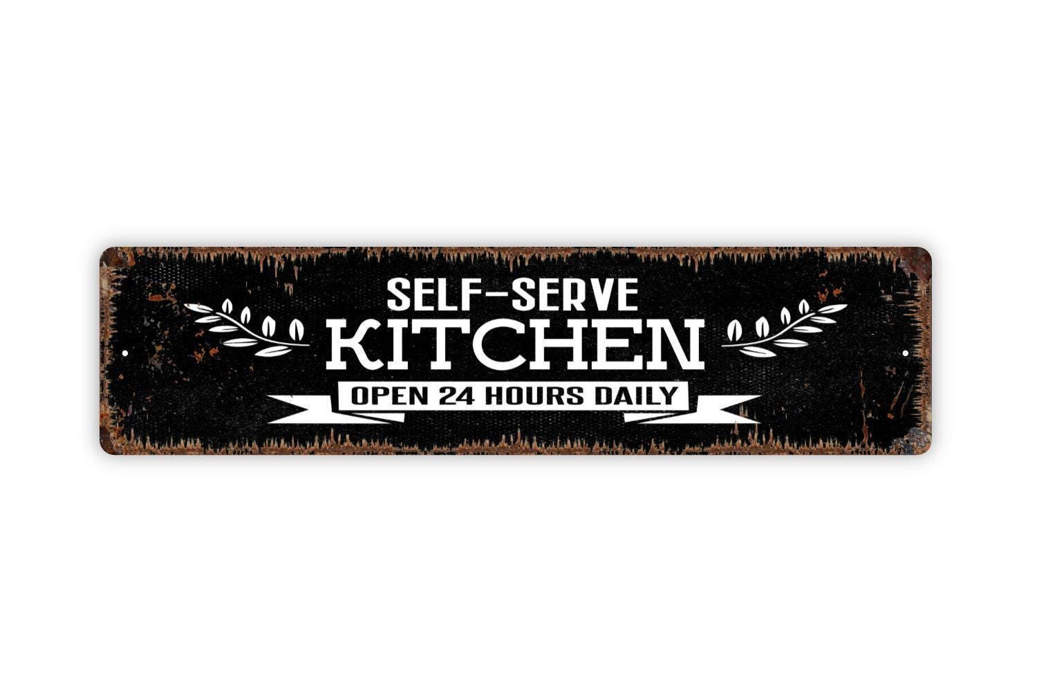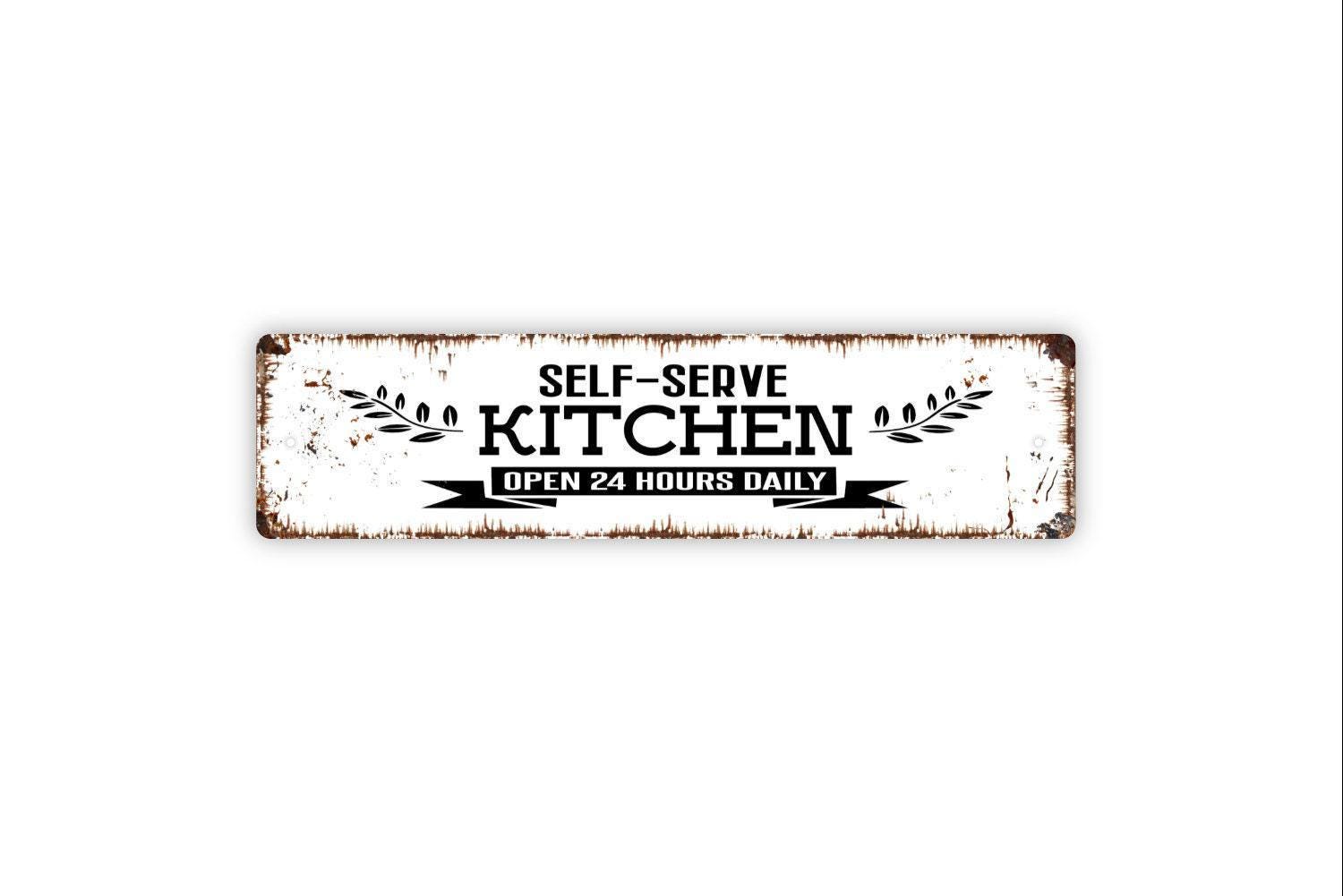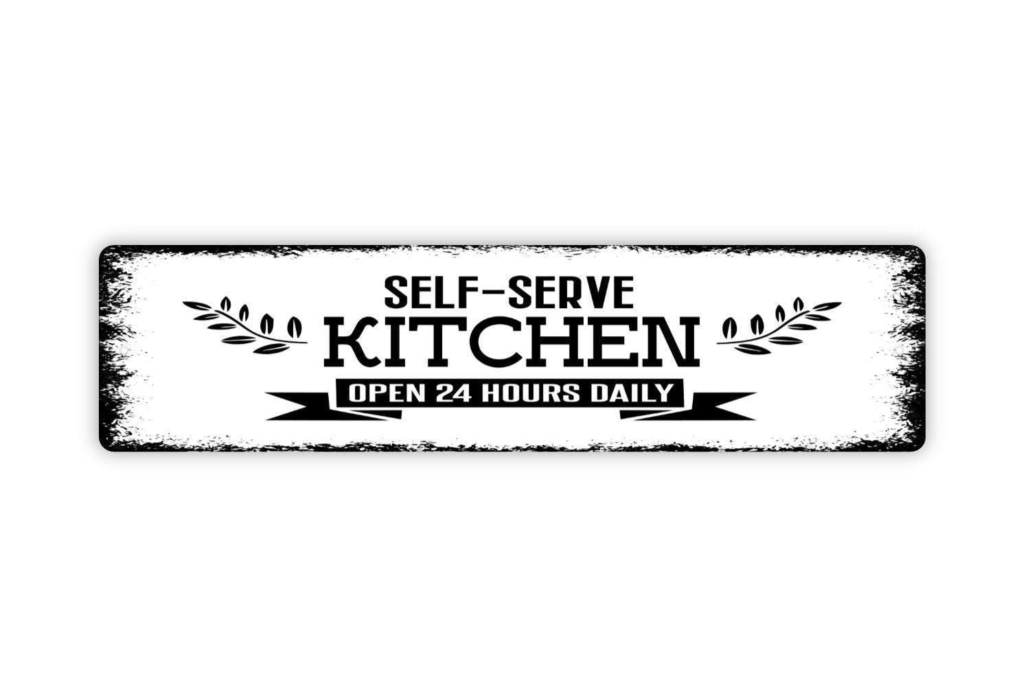 Self Serve Kitchen Open 24 Hours Sign – Funny Farmhouse Wall Decor – Bed and Breakfast Guest Room Dining Sign – Metal Sign or Sticker