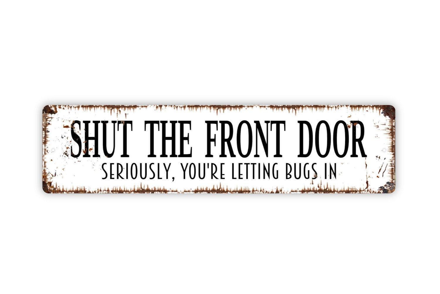 Shut The Front Door Seriously You're Letting Bugs In Sign - Funny Welcome To Our Home Rustic Street Metal Sign or Door Name Plate Plaque