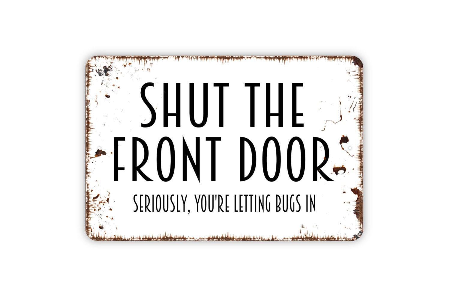 Shut The Front Door Seriously You're Letting Bugs In Sign, Metal Sign, Farmhouse Contemporary Modern Wall Metal Sign
