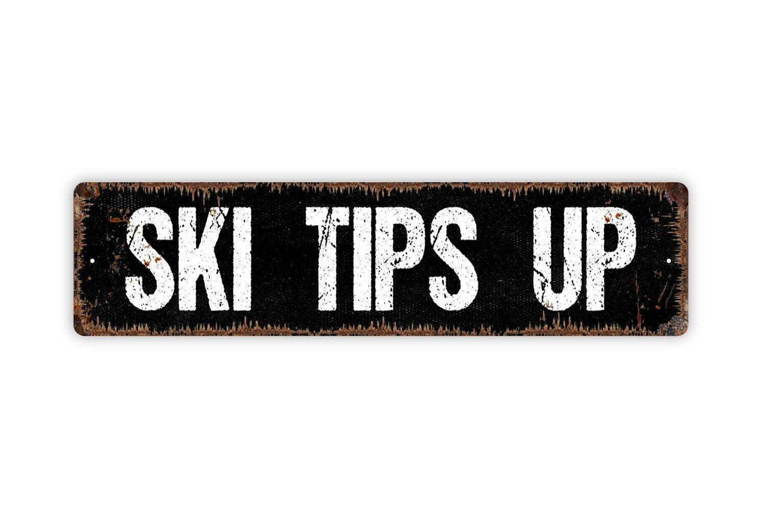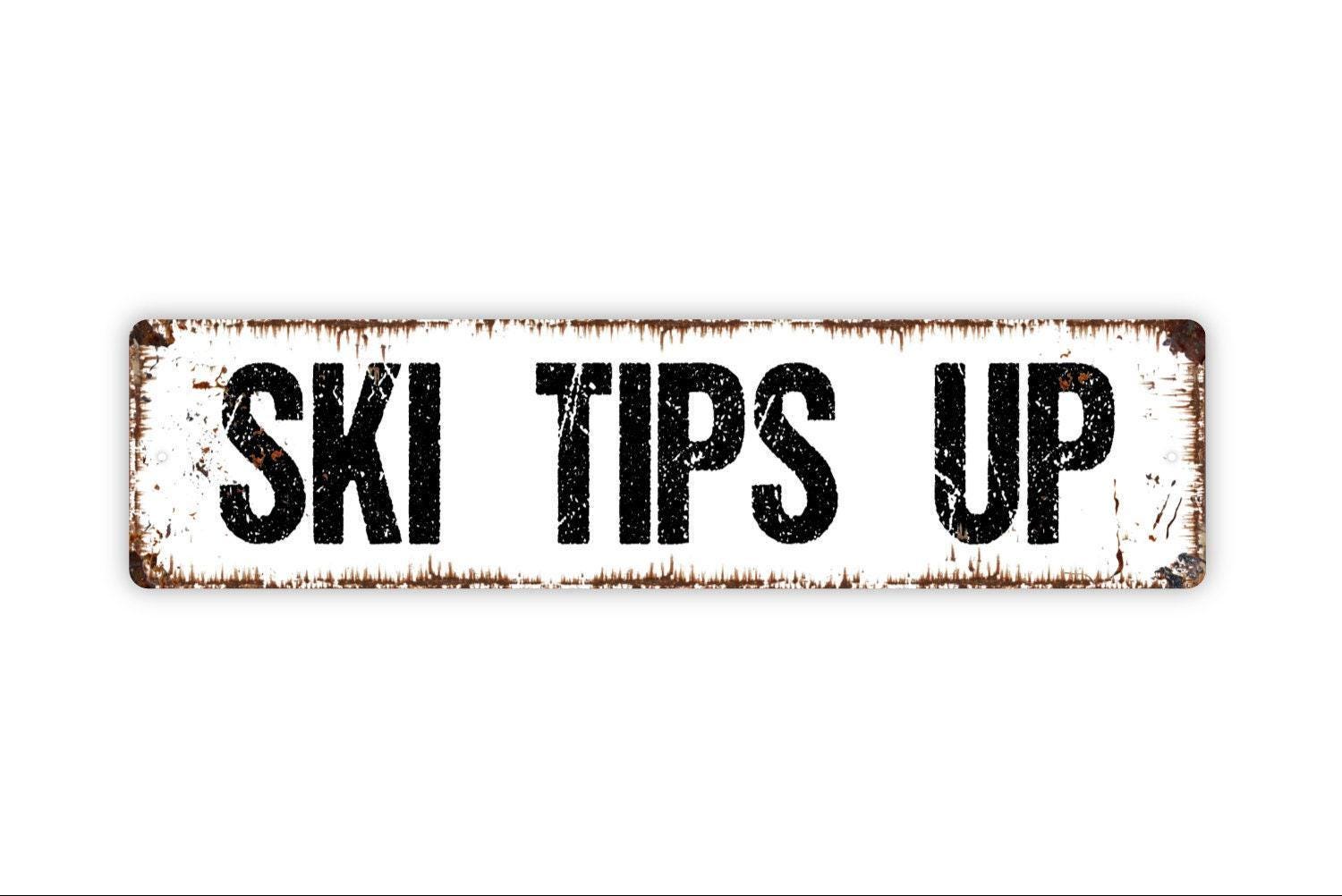 Ski Tips Up Sign - Skiing Slopes Mountain Lodge Apres Ski Snowboard Snow Vinyl Sticker Or Street Metal Sign or Door Name Plate Plaque