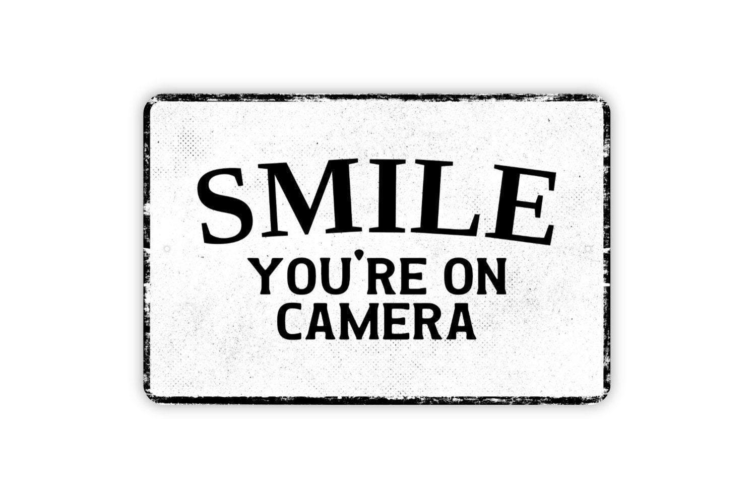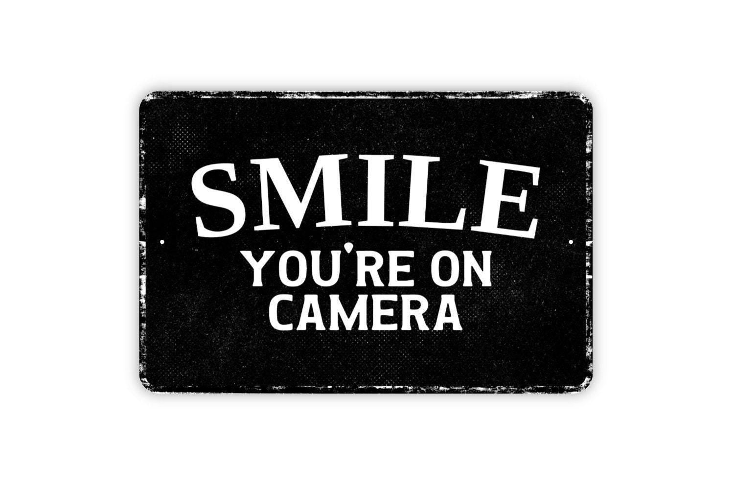 Smile You’re On Camera Sign | Security Warning Door Sign | Funny Surveillance Wall Art | Metal Sign or Vinyl Sticker for Home or Business