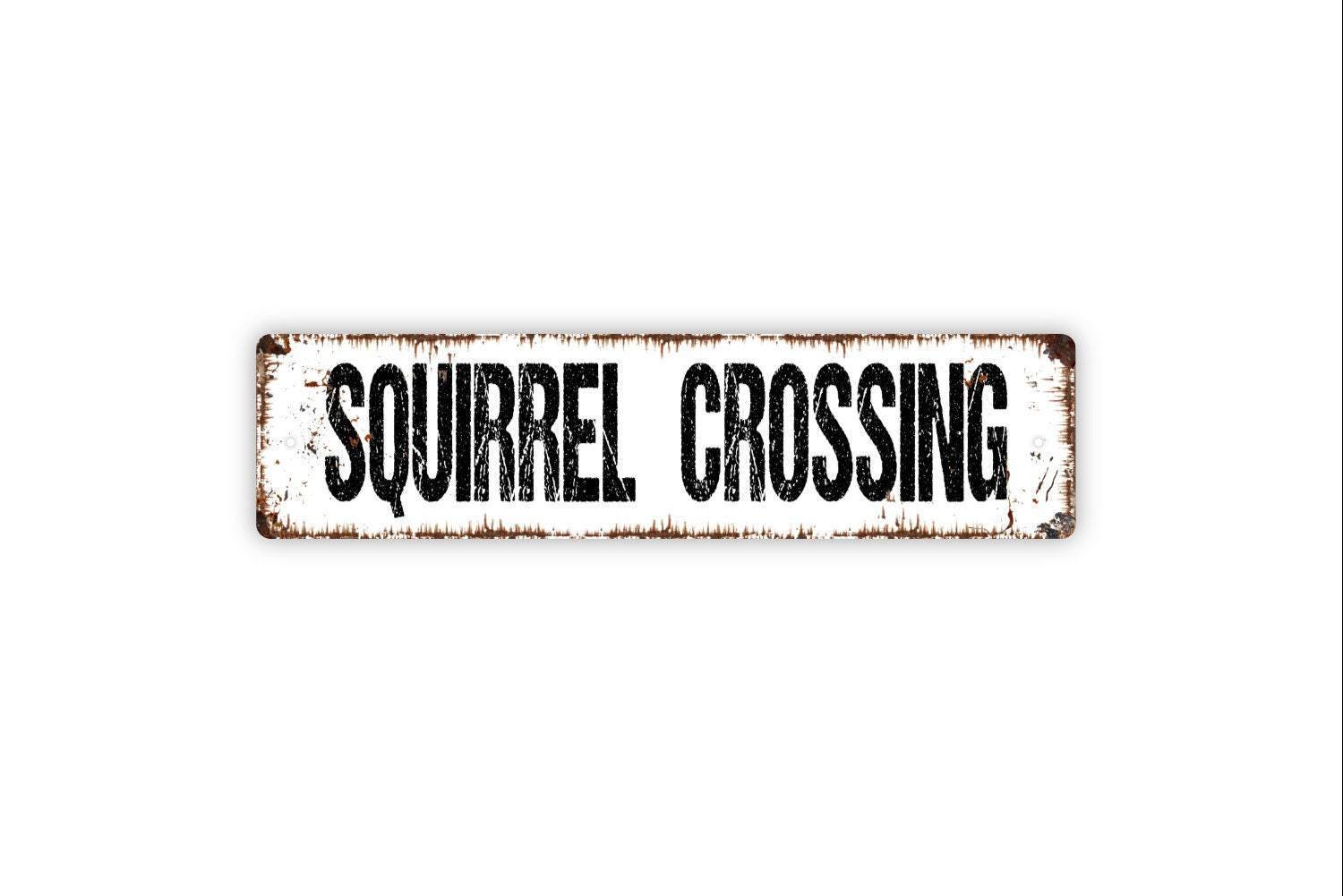 Squirrel Crossing Sign, Funny Farm Ranch Metal Sign, Farmhouse Style Decor, Vinyl Sticker Or Street Sign or Door Name Plate Plaque