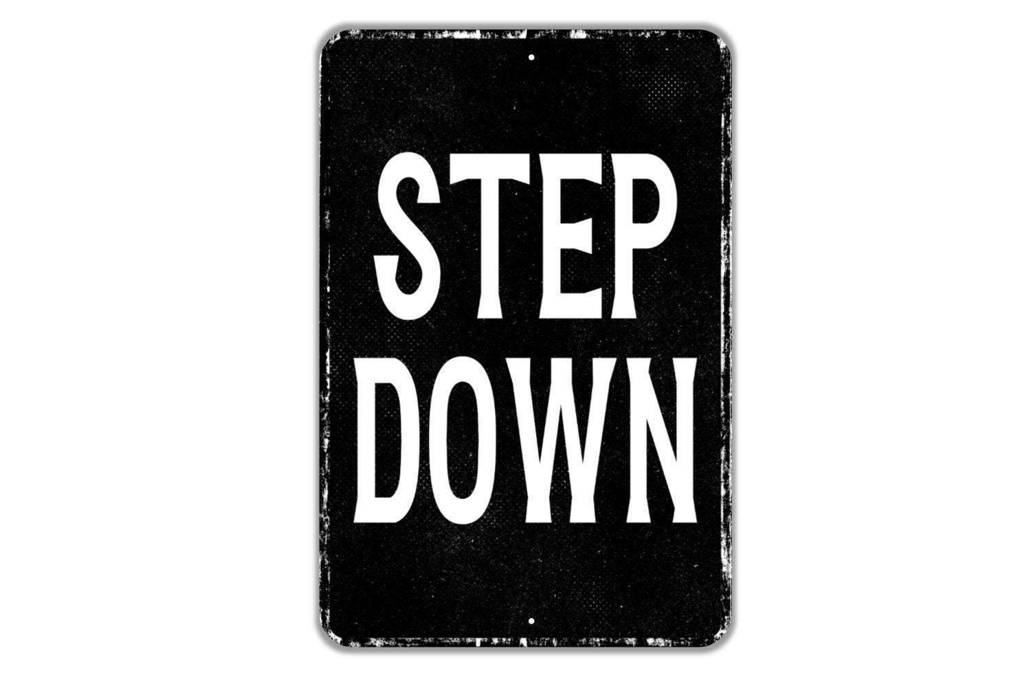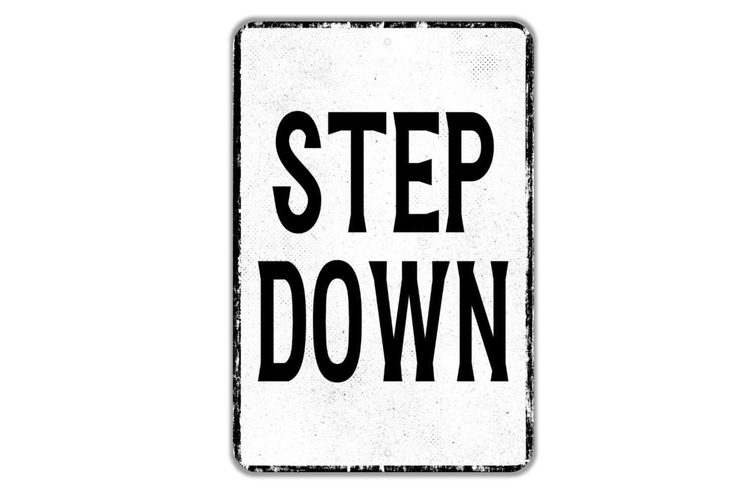 Step Down Sign | Safety Warning Metal Sign or Vinyl Sticker | Workplace, School, Business, Construction, Industrial, Hazard, Caution Notice
