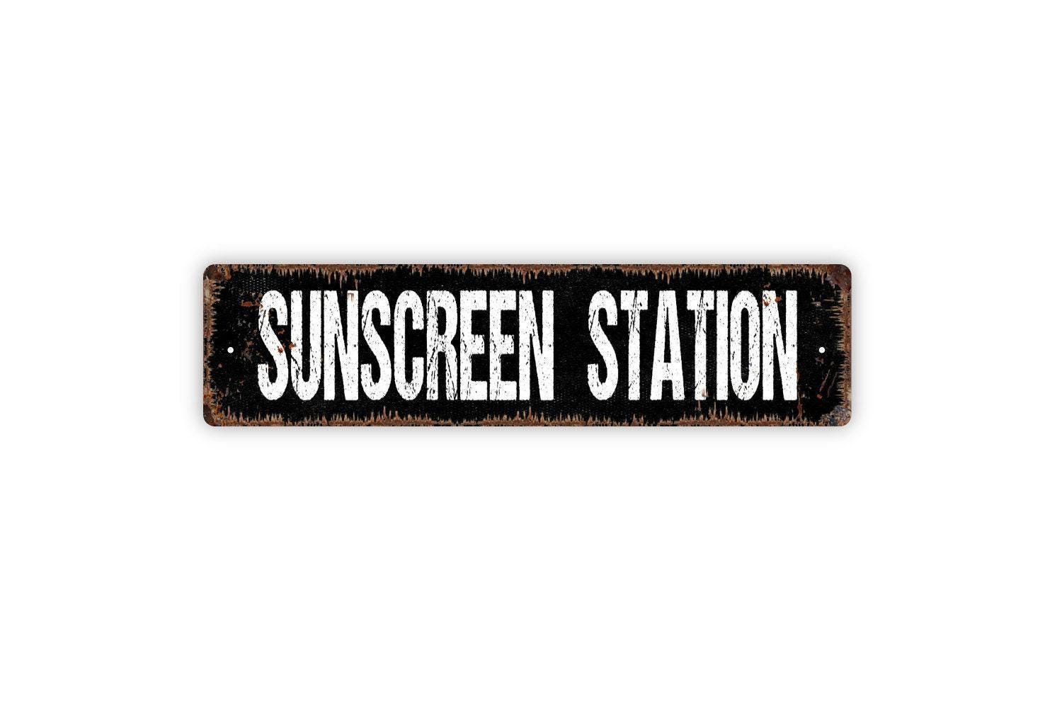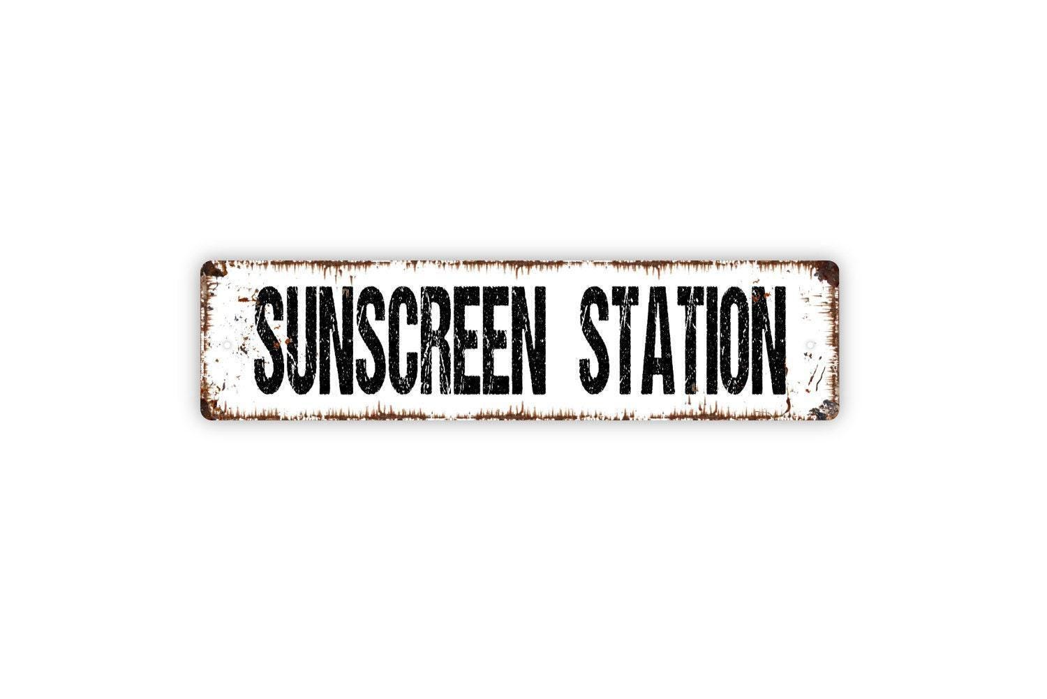 Sunscreen Station Sign - Pool Bathroom Guest Bath Showers Beach Vinyl Sticker Or Street Metal Sign or Door Name Plate Plaque