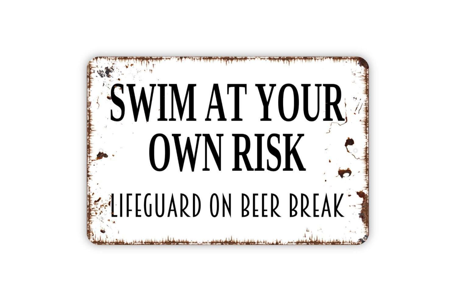 Swim At Your Own Risk Lifeguard On Beer Break Sign - Funny Swimming Pool Metal Wall Art - Indoor or Outdoor
