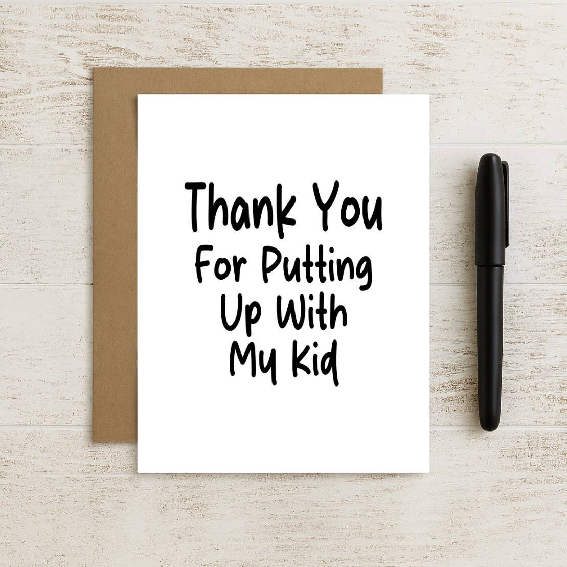Let’s be honest — your kid’s a handful (in the most lovable way, of course). This “Thank You for Putting Up with My Kid” card says what every parent is really thinking, with humor and gratitude all wrapped up in one.