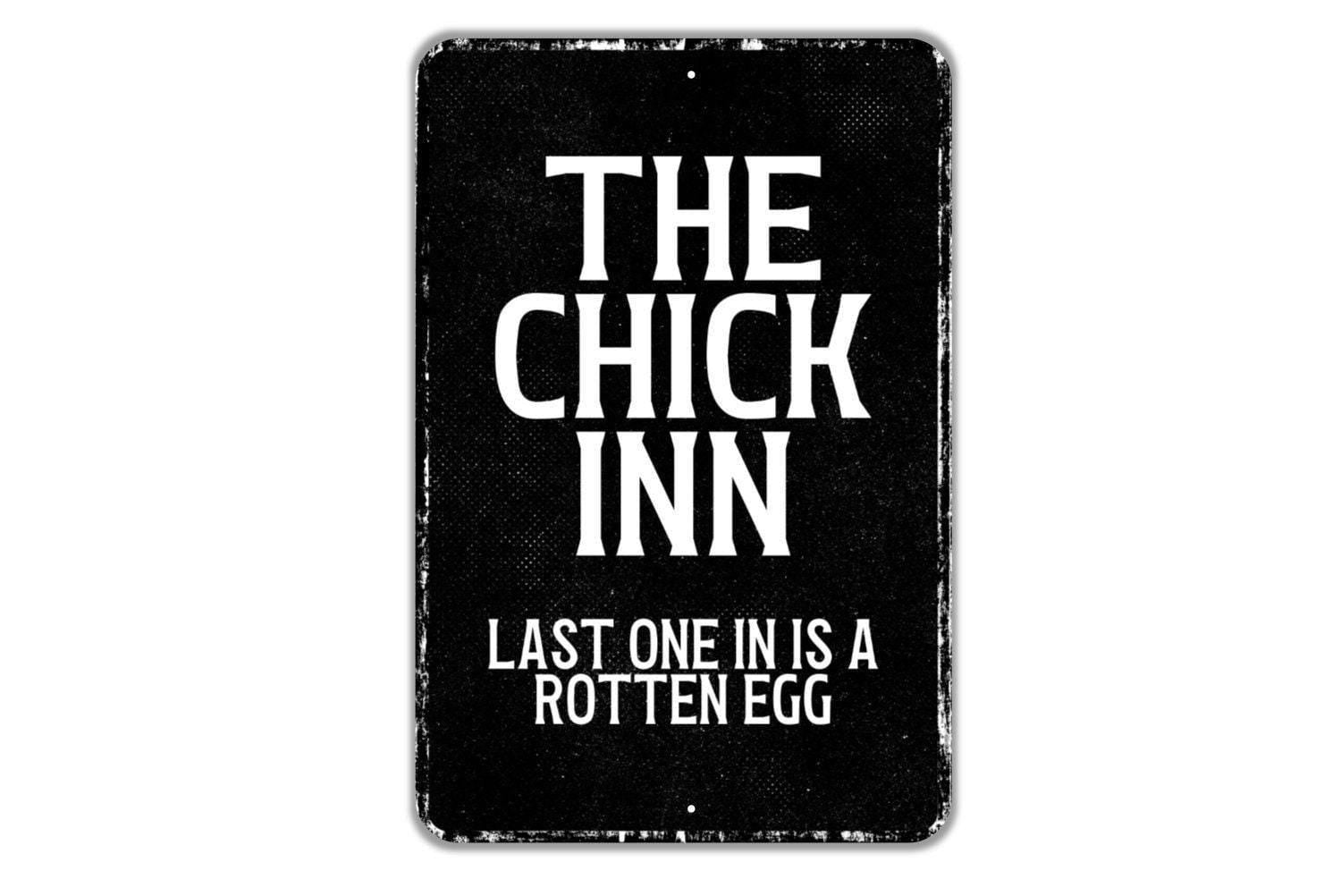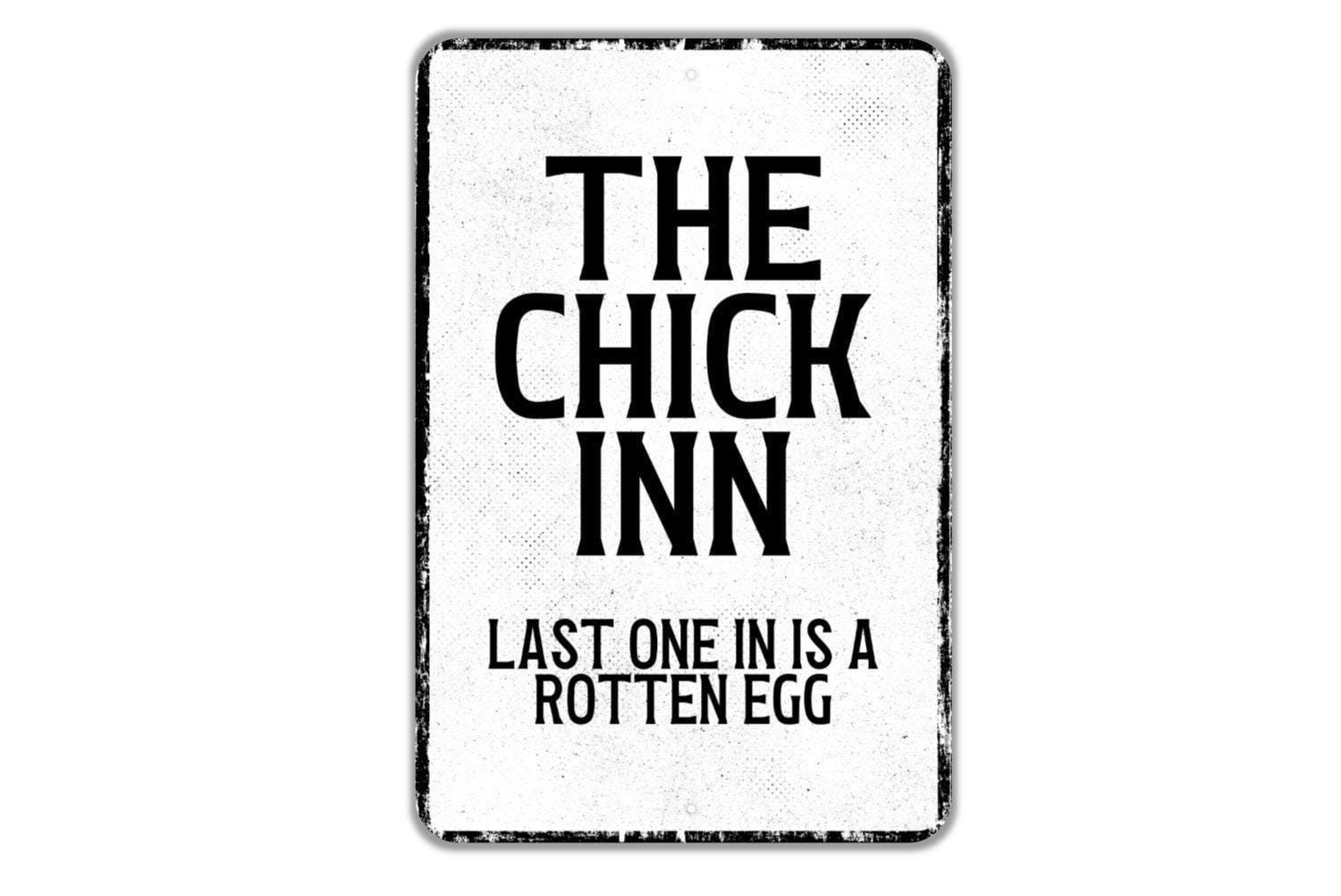 The Chick Inn Last One In Is A Rotten Egg Sign Metal Wall Art or Vinyl Sticker for Chicken Coop, Hen House, Farmhouse Kitchen, Funny Farm