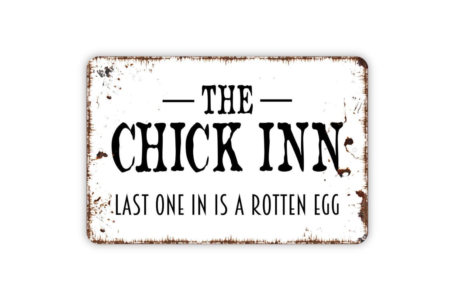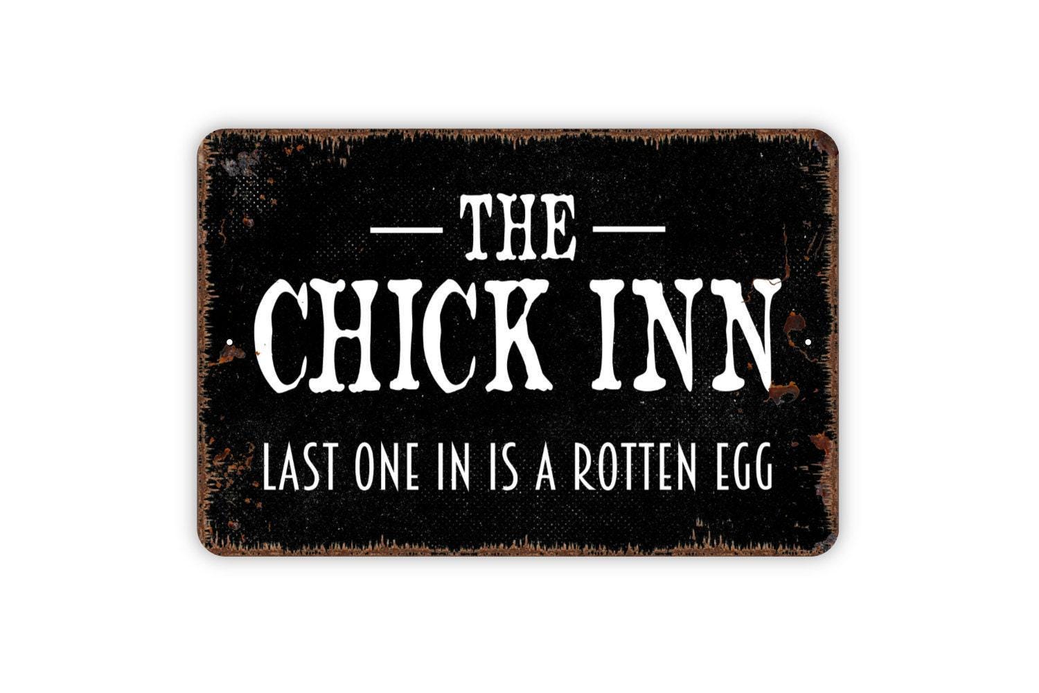 Add farmyard humor with this “The Chick Inn The Last One Is A Rotten Egg” sign, available as a metal sign or vinyl sticker. Perfect for chicken coops, barns, and backyards to bring personality and charm. A playful wall decor piece and fun gift for chicken keepers.