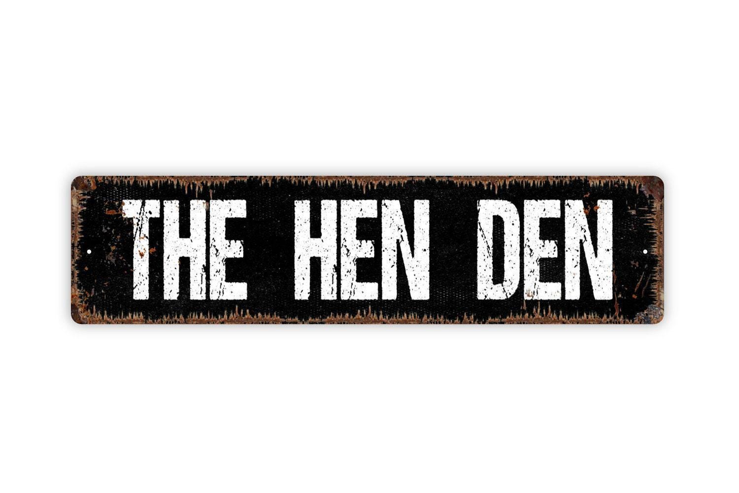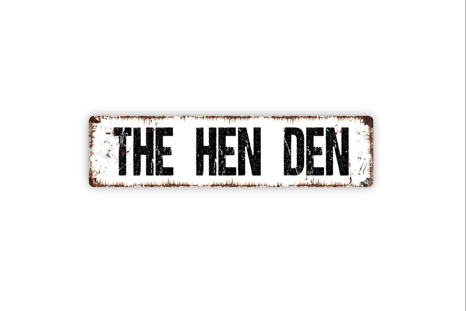 The Hen Den Sign - Chicken Coop Rooster Farm Fresh Eggs Vinyl Sticker Or Street Metal Sign or Door Name Plate Plaque
