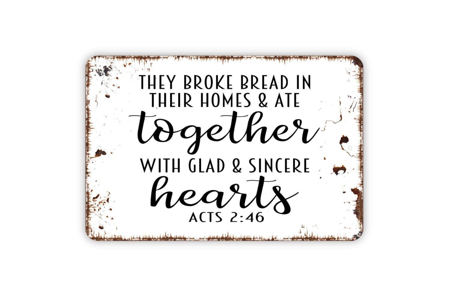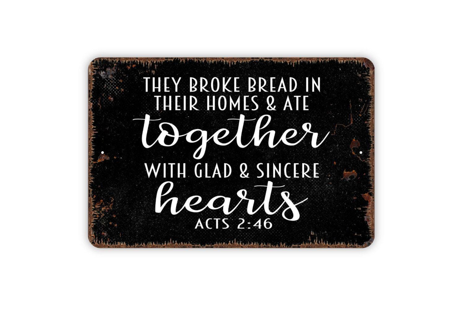 They Broke Bread In Their Homes And Ate Together With Glad And Sincere Hearts Acts Sign - Christian Metal Indoor or Outdoor Wall Art