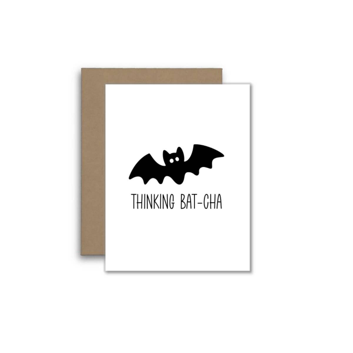 Send a little winged warmth with this “Thinking Bat’cha” greeting card, featuring an adorable bat illustration. Perfect for Halloween, thank-yous, or just-because moments, this playful pun is a fun way to let someone know they’re on your mind.