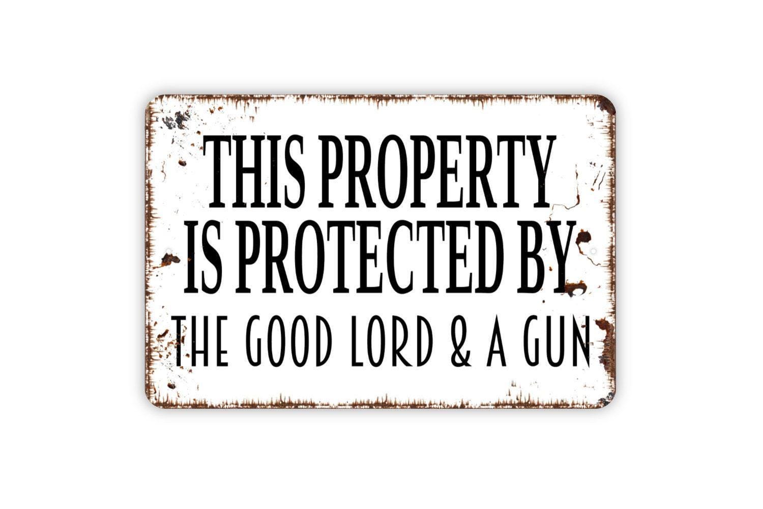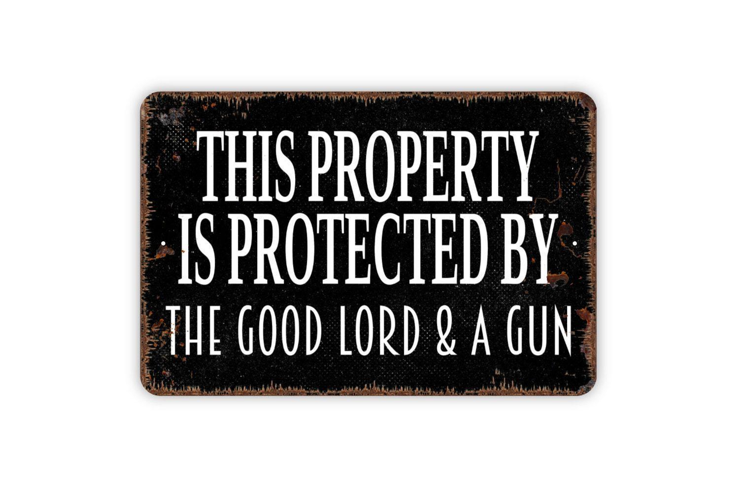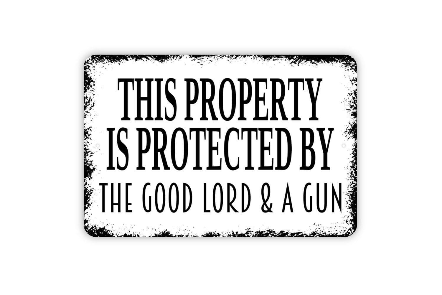This Property Is Protected by the Good Lord and a Gun Sign Metal or Vinyl Sticker | Funny Farmhouse Wall Art | Rustic Country Home Decor