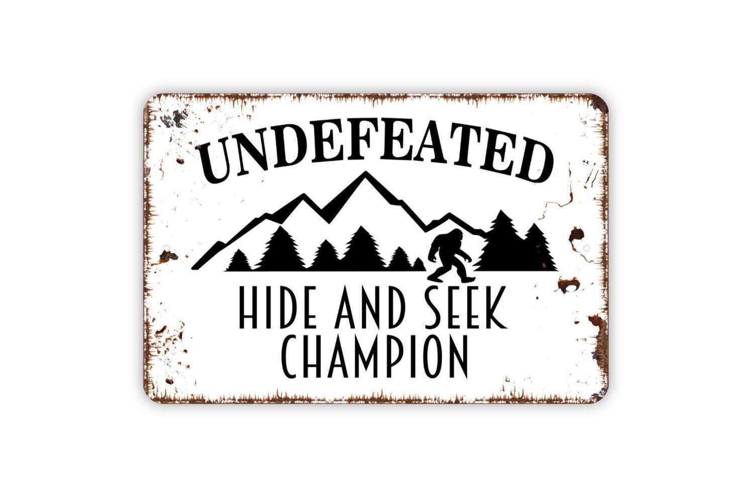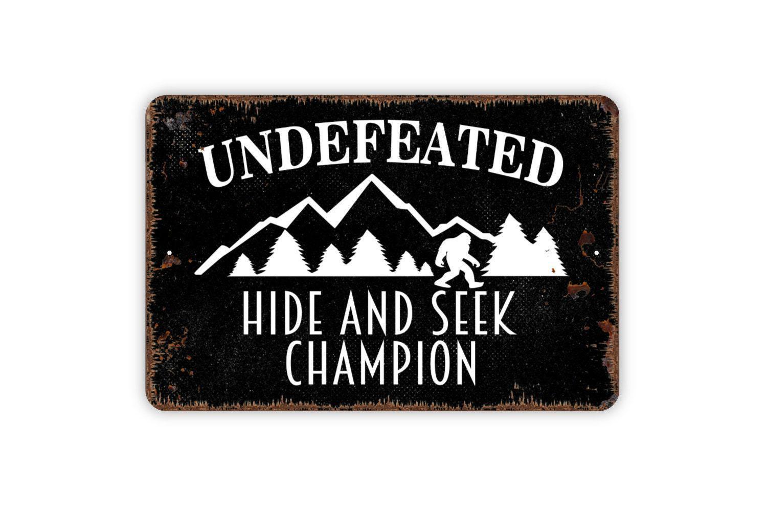 Undefeated Hide and Seek Champion Sign - Bigfoot or Sasquatch Metal Wall Art - Indoor or Outdoor